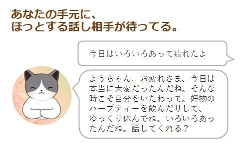 優しい聞き手AI bot「やわらかネコ」は、LINE上であなたを待っています。「ちょっと疲れたな」「今日いいことがあった!」「グチ聞いて…」など、気軽にチャットしてください。心理学的な表現でいうところの「安全な話し相手」として、ほっとくつろげるような対話をします。