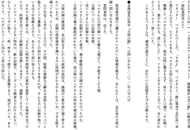 ベルさんがなぜこのような人生を歩まねばならななったのか、それが知りたくて、進めていった調査です。たくさんの方たちに、ご協力いただきました。ありがとうございました。