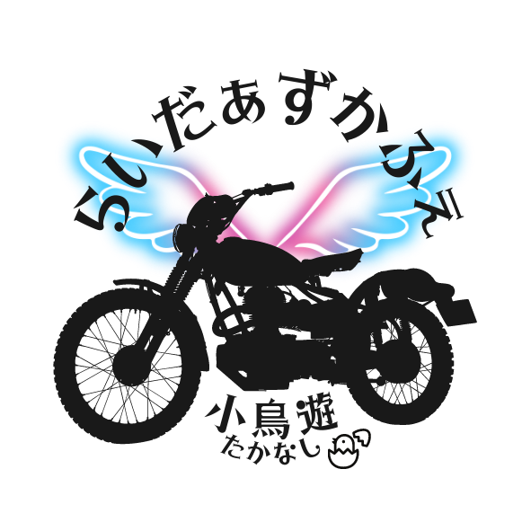 店名は『らいだぁずかふぇ 小鳥遊』。ロゴは、ライダーが飛ぶように集まってきてくださる様子をイメージしています。わたくしの居る場所がライダーのスポットであることが店名を見るだけで分かるようにしたいという願いから、この名前に決めました。