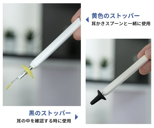 黄色のストッパーは耳掃除の時に、2つの黒のストッパーは耳の中を確認する時に使用してください。