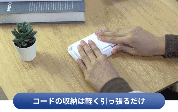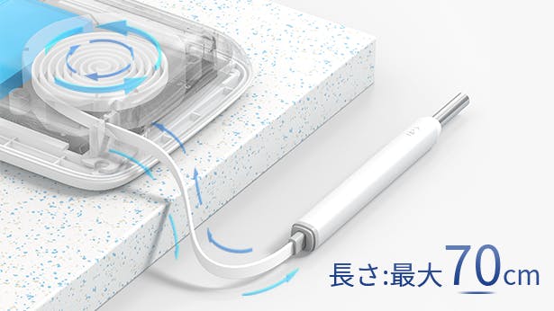 撮影ヘッドは本体背部に収納することができ、使用する時に少し力を入れて引っ張ると取り出せます。撮影ヘッドのコードは70cmまで伸ばすことが可能で、使い終わったら軽く引っ張るだけで本体に収納されます。