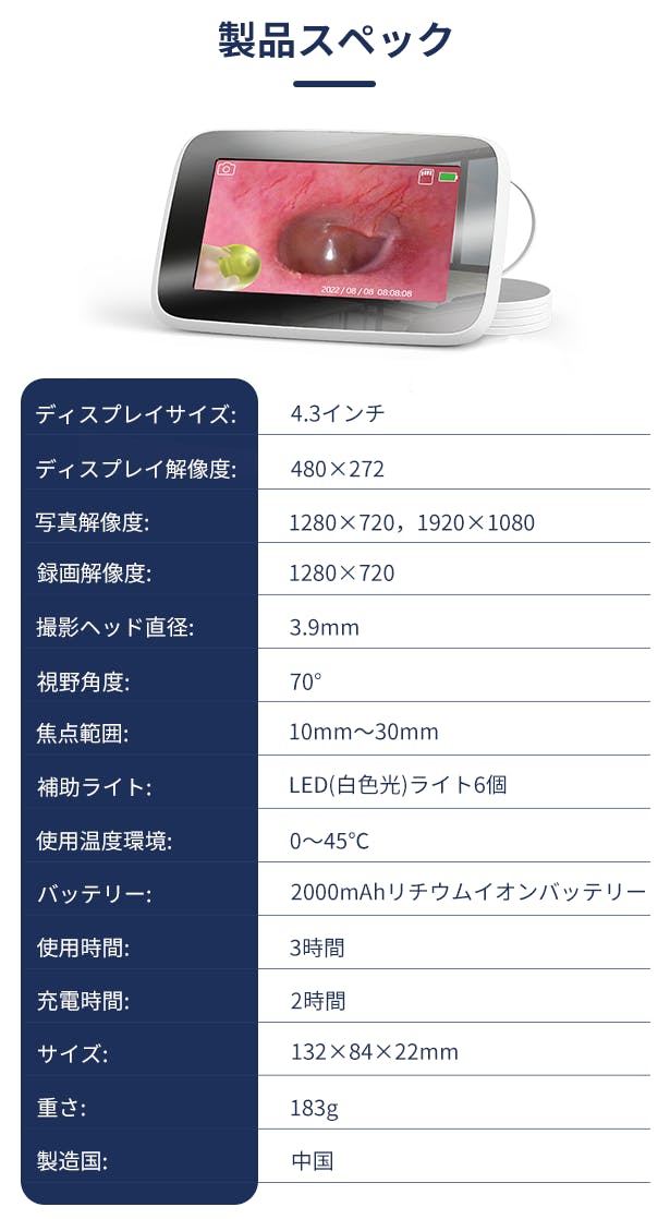 MS430は200万画素のマクロレンズを内蔵しており、解像度1920×1080で写真を撮影することができます。レンズの直径はわずか3.9mmですので、耳の奥のほうまで入り、汚れを見逃しません。