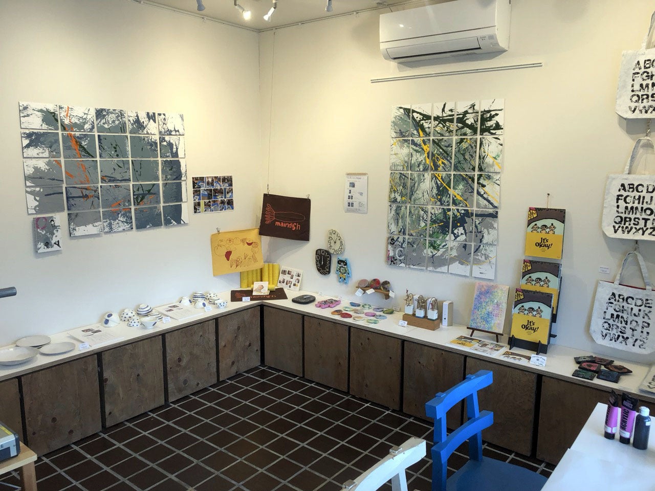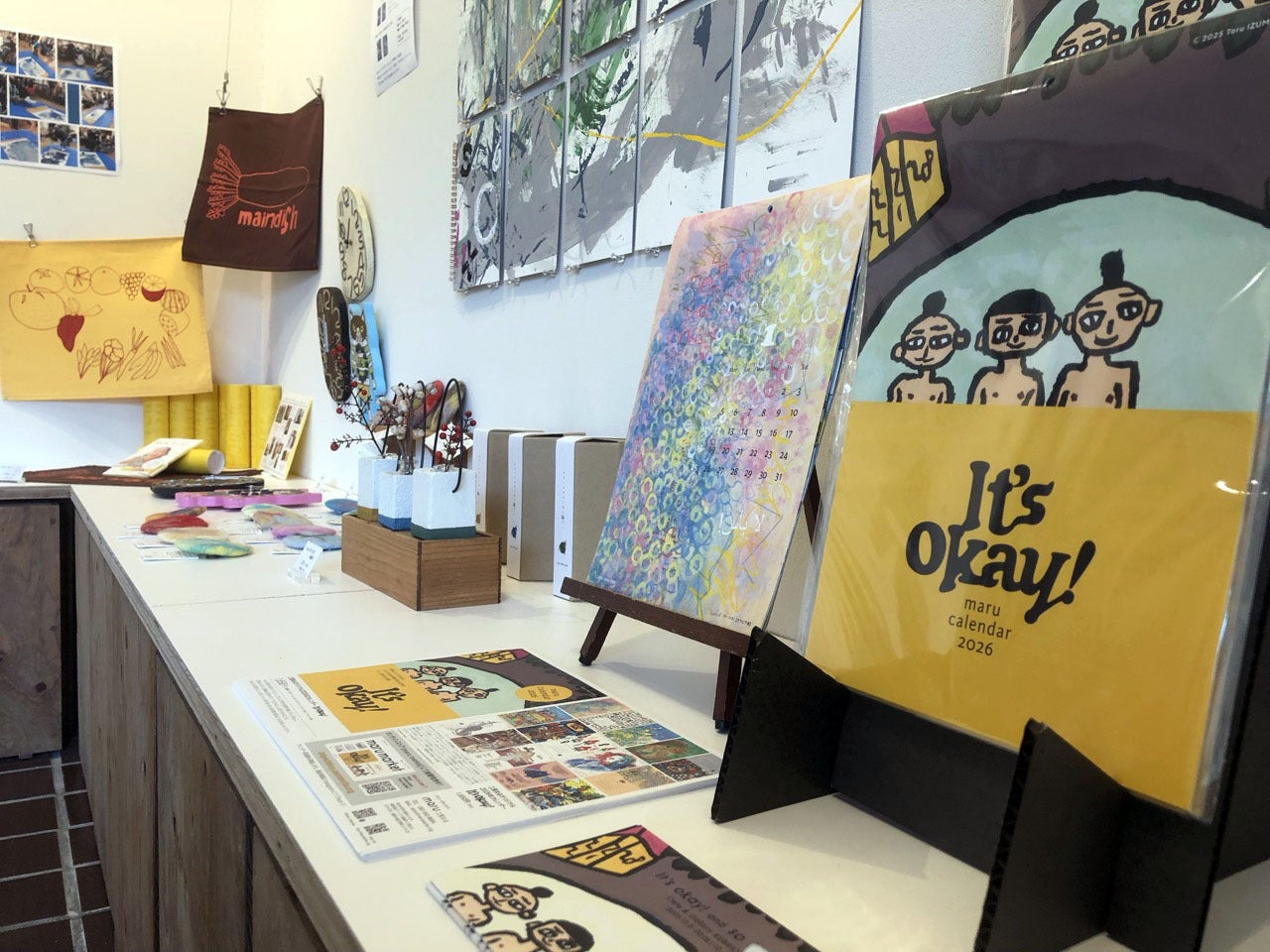 今回の企画は、12月から新年にかけて、心あたたまる贈り物の季節に「まるのまど」がお届けする、maruグッズセレクション。2026年maruカレンダー「It’s Okay!」をはじめ、ステーショナリーやアクセサリーなどのアート雑貨から、メンバーの温もりある手しごとが光る陶器や木工のクラフト品まで、工房まる珠玉の品々を取り揃えました。