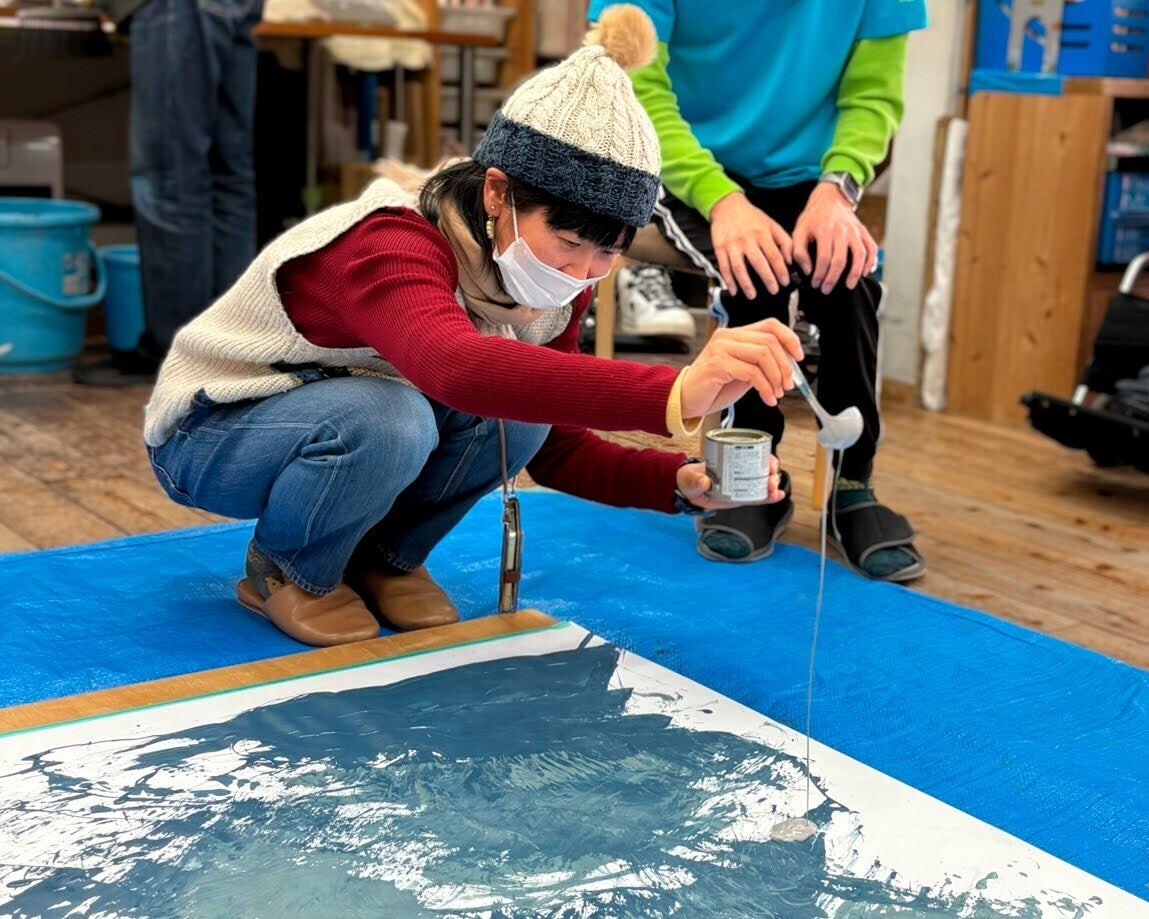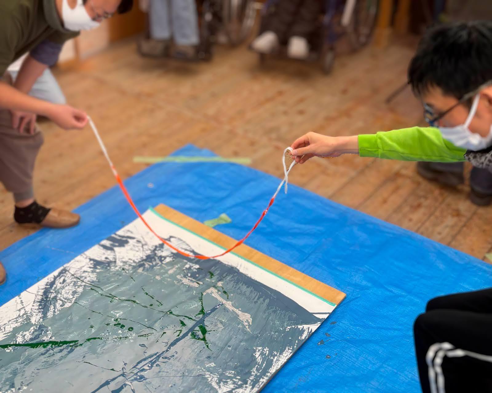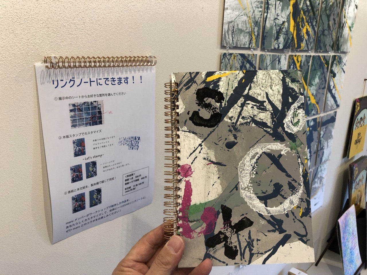 また本展では初試みとなる特別な企画をご準備しております。日頃それぞれのアトリエに分かれて活動しているmaruメンバー。個々様々な障害がありますが、みんなが参加できる方法を考えて共同制作した1mを超える大判サイズの作品を展示し、その中から、お好きな部分を表紙にして、オリジナルのリングノートが作れます。