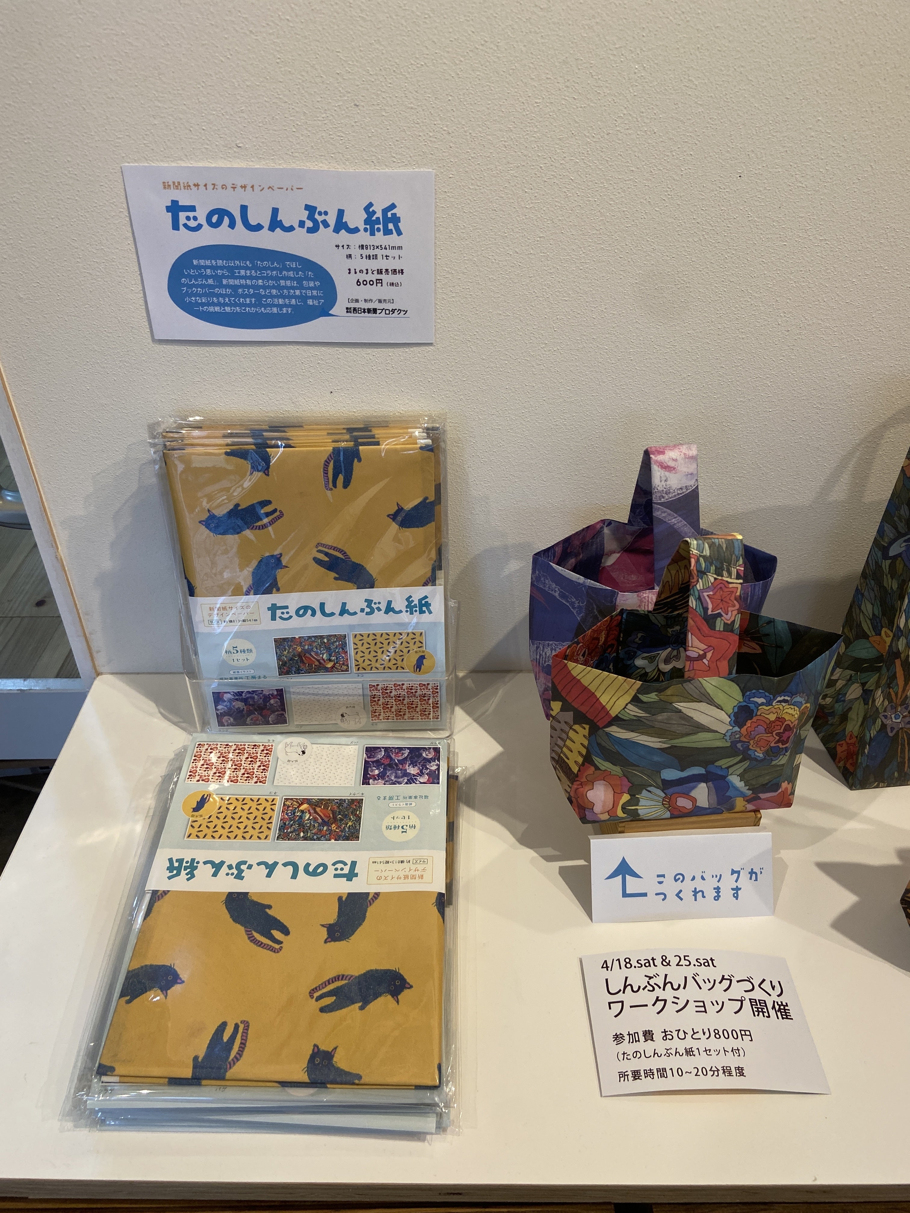 このたび発売を記念して、「たのしんぶん紙」の活用・制作見本とデザインの原画作品を展示する「maru meets たのしんぶん紙」を開催します。会期中の土曜日には、「10ミニッツバッグ」制作のワークショップも実施。名前のとおり、約10分で新聞バッグを作ることができます。