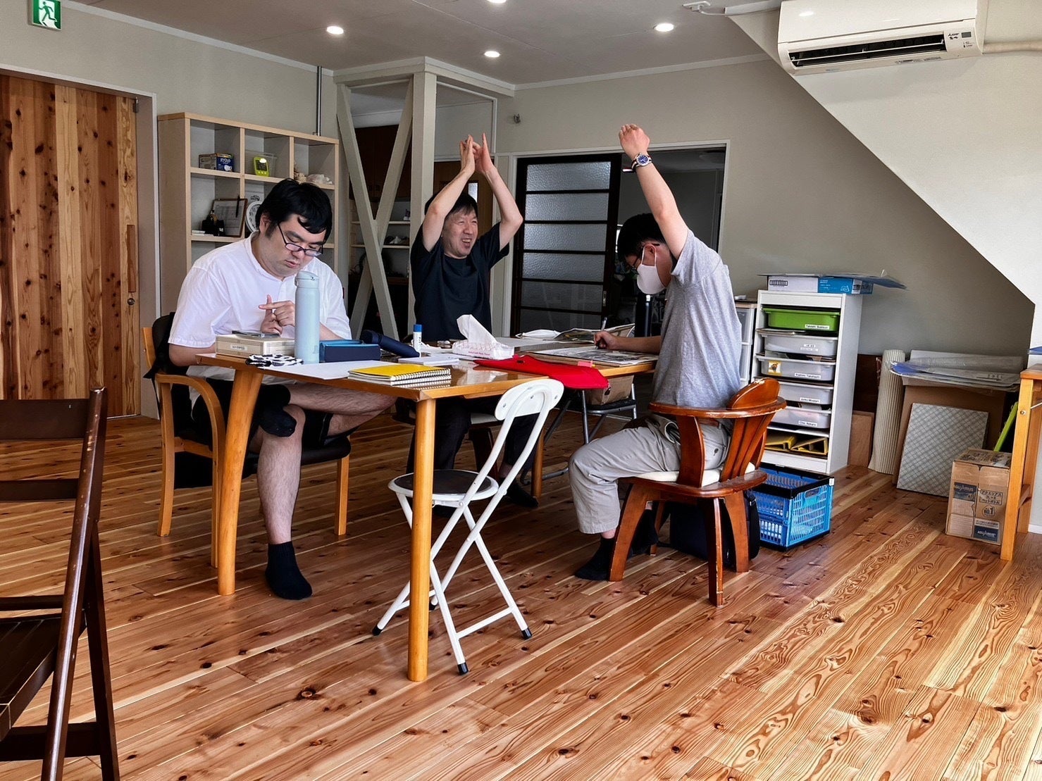 田村での活動がスタートして2週間。この広くて明るい空間が心地いい1階のアトリエです。毎日のルーティーン。ダンスも気持ちよく踊れます。この無垢材のフローリングが一番のお気に入り、と話す水沼さん。水沼さんのお気に入りのこの床は、施設長とスタッフ田中が自らワックスがけした愛着のあるフローリングです。アトリエの真ん中には向かいあって作業できるテーブルがあります。あんなに広かったスペースがメンバーでいっぱいに!?みんなが集いたくなる空間です。2階の和室ではこんなくつろぎ方が最高です!そしてこちらは、作業スペースの工事など引っ越しを優先し、内装をやり残して倉庫と化しているギャラリー&ショップスペース。リターン内覧会もあります。このままにしておくわけにはいきません。9月中にここも素敵な空間に整えます!ウキウキしてる田村のアトリエからの報告でした!