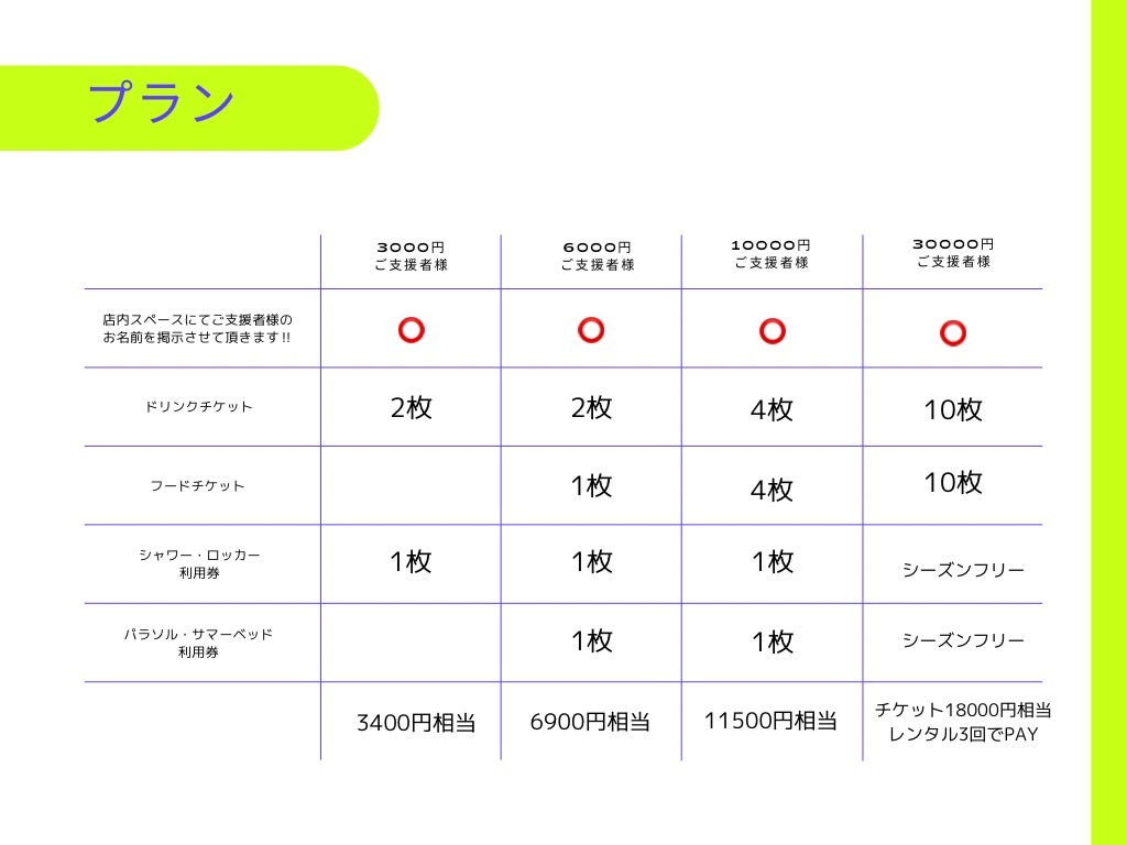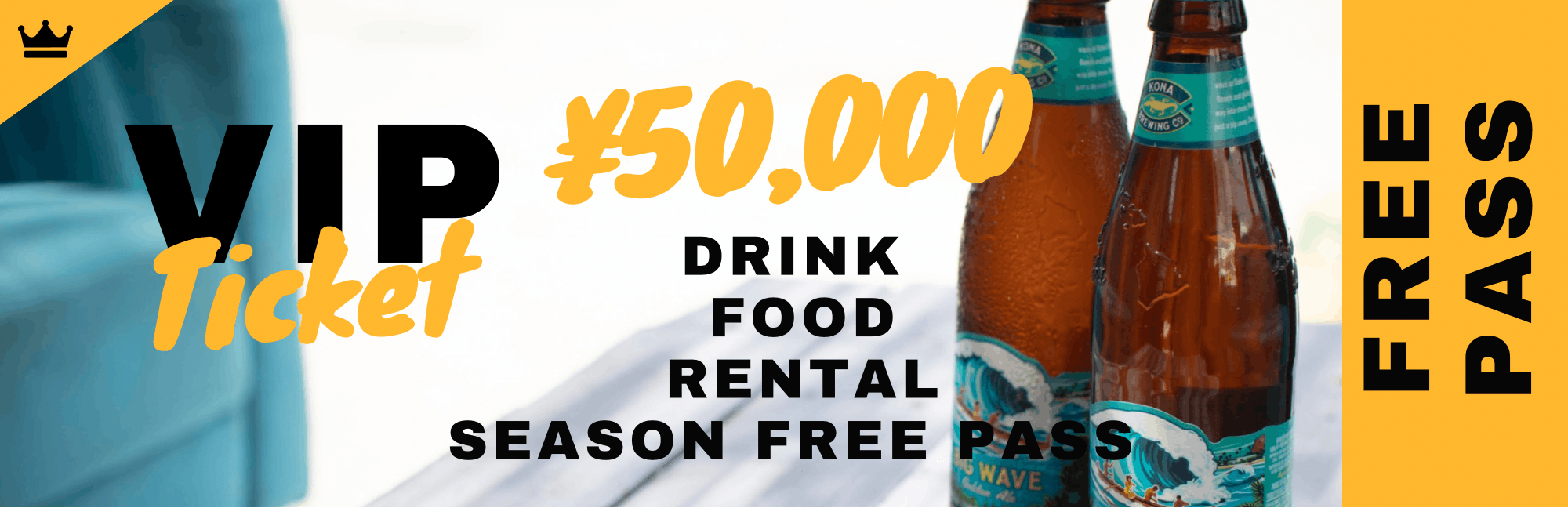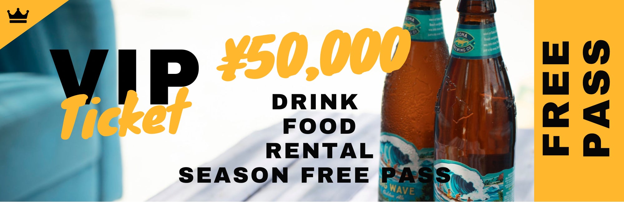 Vip ticket 50,000円ご支援者様2023年海の家上記プランすべての項目がフリーパスとなります。