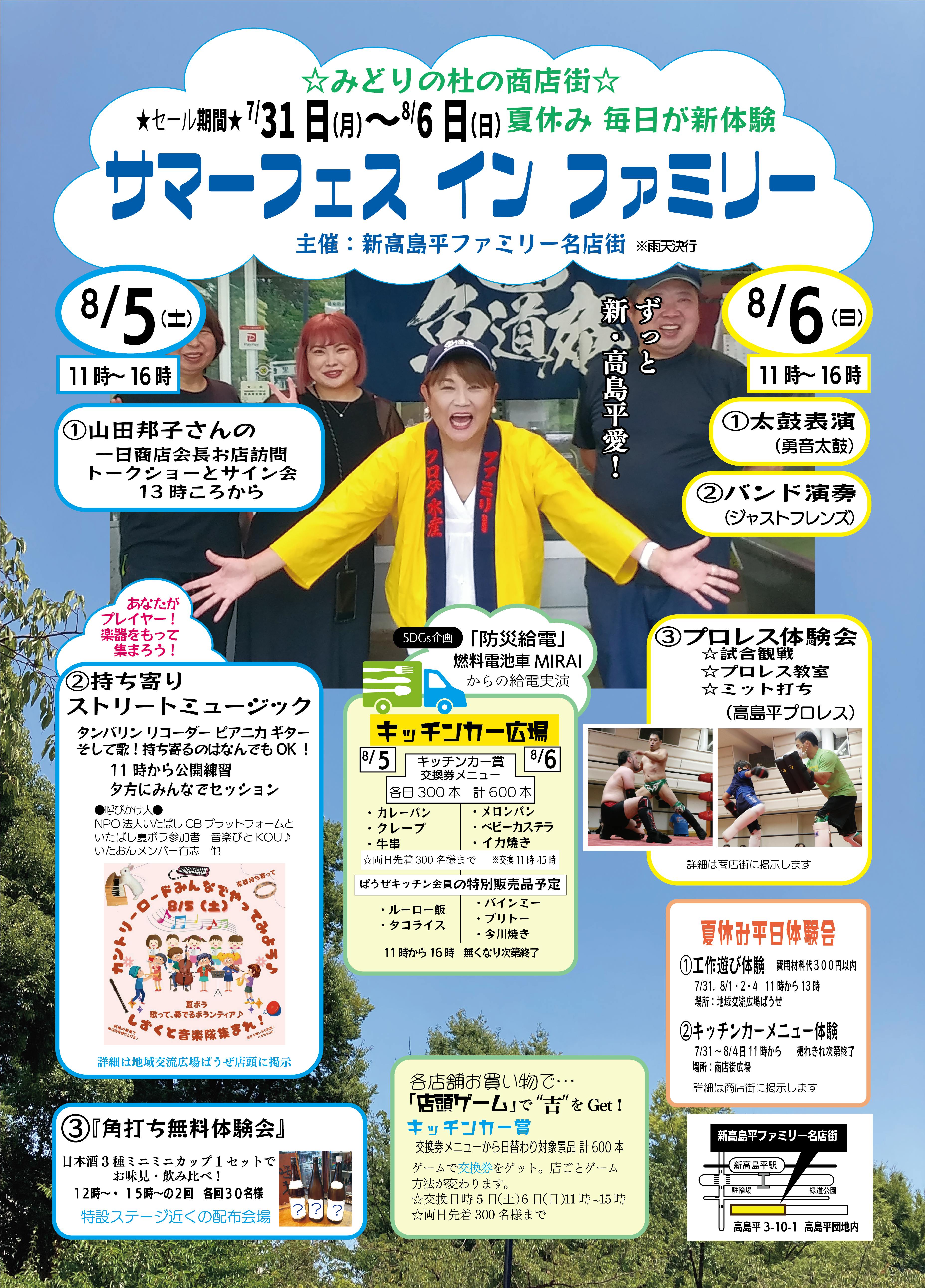 今年は8月5日・6日(日)に高島平3丁目団地『新高島平ファミリー名店街』でのイベント開催が決まり、6日にプロレスの試合を3試合と観戦に来られた方向けのプロレス教室などを行います。
