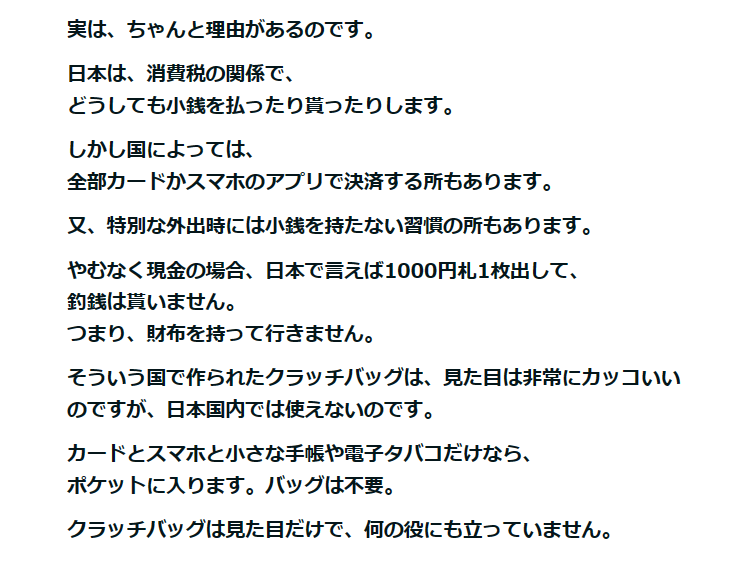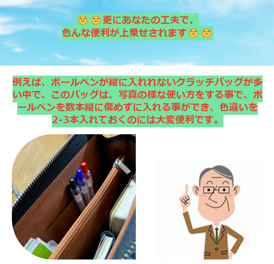 こんにちは、有限会社野村書店野村浩です。今回は日本でも実用的なかっこいいクラッチバッグをご紹介します。日本人で普段財布を持たずに外出する人は何%でしょう?財布無しでスマートに行動する国もあります。そのような人向けのクラッチバッグは多くありますが、財布が入りません。そこで今回ご紹介するのは長財布も入ってスマートでカッコイイ男のクラッチバッグの集大成版!です。
