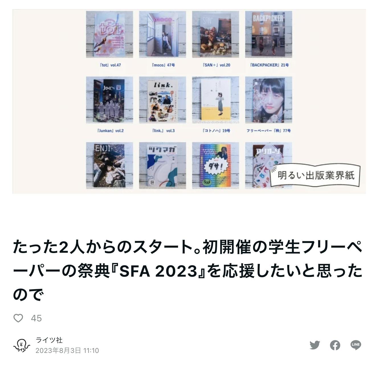 2023/08/04 21:32先日、ライツ社さんに取材していただきました。ライツ社は兵庫県明石市にある出版社です。協賛依頼をするためにメールを送ったところ、SFAの活動に大変な興味を示していただき、すぐに取材・記事化が決まりました。取材が終わったのが12時過ぎ、初稿を上げてくださったのがなんと17時22分!!僕が昼寝をしている間に、恐ろしいスピードで文字起こしから初稿までを完成させてくださったのです。まさに仕事人。こちらからの修正依頼にも一瞬で応えてくださり翌朝には記事が公開されていました。記事の中では、SFAを企画するに至った経緯や、私(諸橋)が個人的に興味を持ったフリーペーパーなんかについて話しています。突っ込みすぎて泣く泣くカットにしてもらった箇所もあったのですが、それくらい話しやすく、気持ちよく口が乗ってしまいました。これもプロの編集者の聞く力というものなのでしょうか。恐るべしです。私は広報というものがあまり得意ではなく、SNSでの広報は別のメンバーに任せているのですが、ここだけは自分でやる!と張り切っておりました。しかしこうして活動報告を書き込むのも記事が公開されてから多少時間が経ってからになってしまっています。やはり適所適材に例外はありません。この記事のこと以外にも書こうと思えば書くことはいくらでもあったのですが、気づけばクラファン期限も残すところ二日となってしまったので、頭を抱えております。今取り組んでいることとしては、当日の様々なノベルティ調達のためのやりとりやその雛形作成、協賛関連のやりとり、審査に関する連絡、各種広報、当日の流れ調整などです。めちゃくちゃ忙しいです。僕らに夏休みはまだ来ません。でも、20日を楽しみにしてくださっている方が大勢います。そのことを思うと、やる気が出ます。みなぎります。以前、参加してくれる団体からお手紙をいただいたのですが、ちょっと泣きました。クラファンの支援者の方々も本当に嬉しいメッセージをくださいます。みなさんありがとうございます。良いイベントにしてみせます。SFA 諸橋 もっと見る