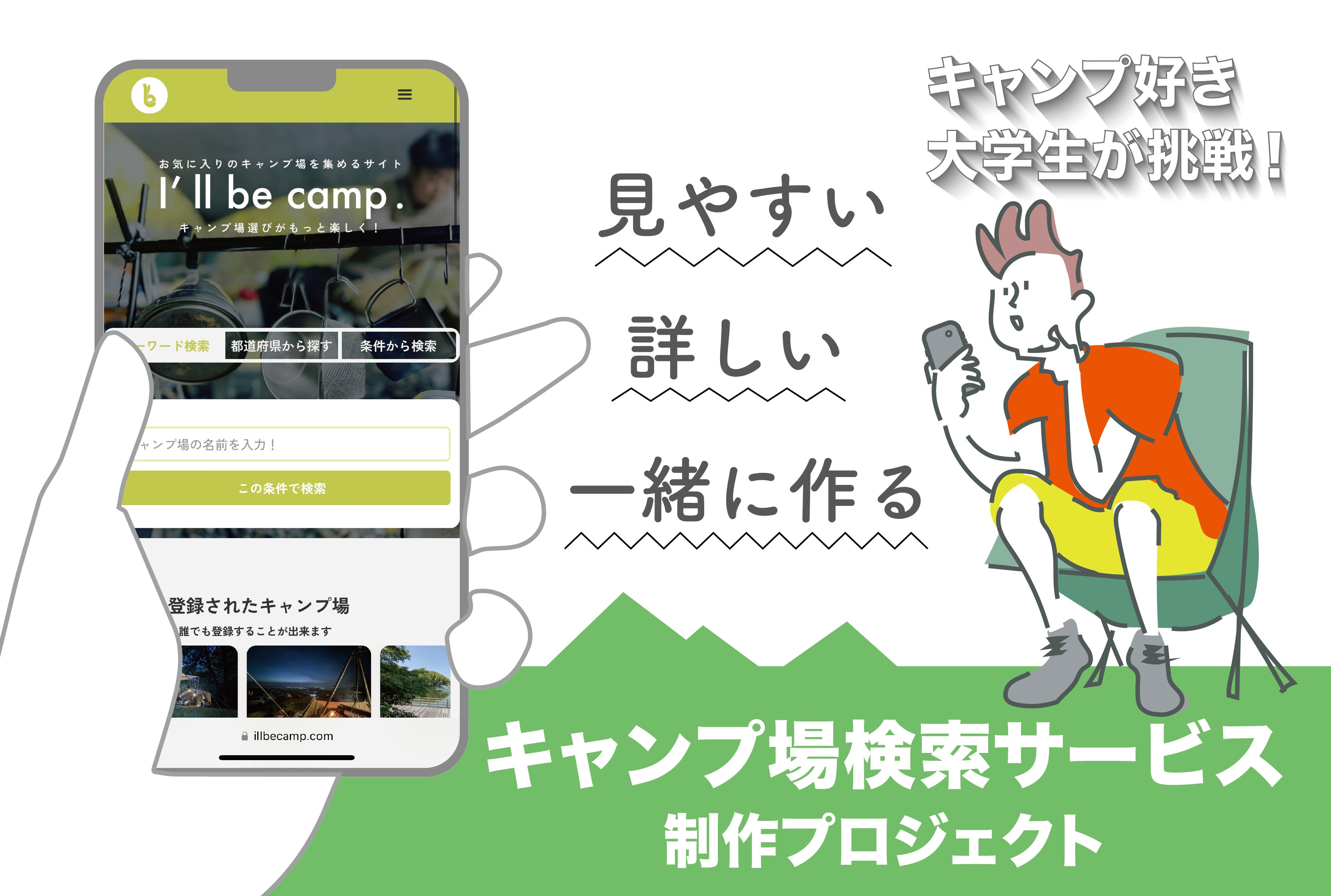 大好きなキャンプをもっと楽しくしたい。そのために、まずは多くのキャンパーの課題である大変なキャンプ場選びの時間を「I'll be camp!(今からキャンプだ!)」と思えるような楽しいひとときに転換します。