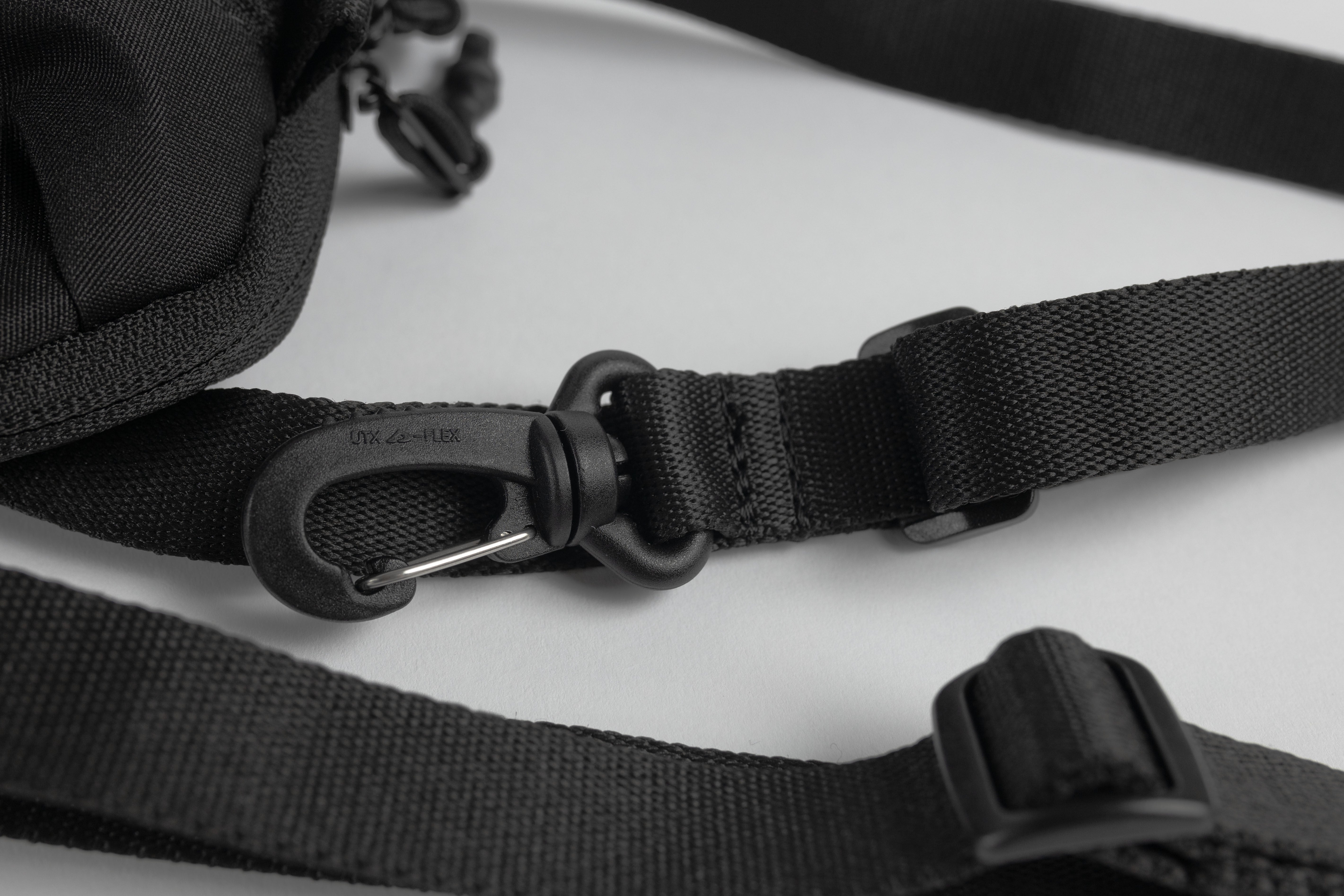 ショルダーベルトにはフック(ナスカン)を配しているため、鍵やイヤホンはこちらに引っ掛けてもOK。