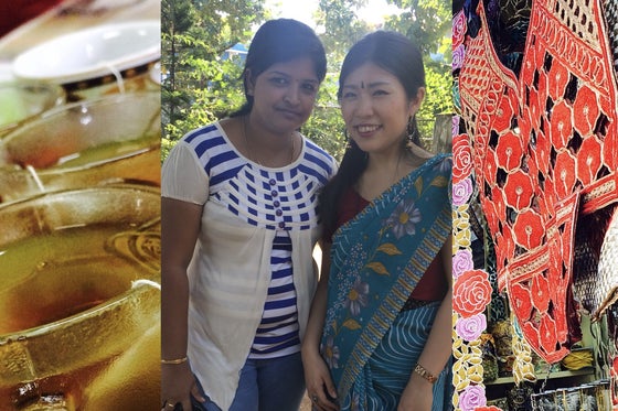 女性たちが手刺繍したブローチやスリランカの紅茶が入ったオリジナル巾着セット。
