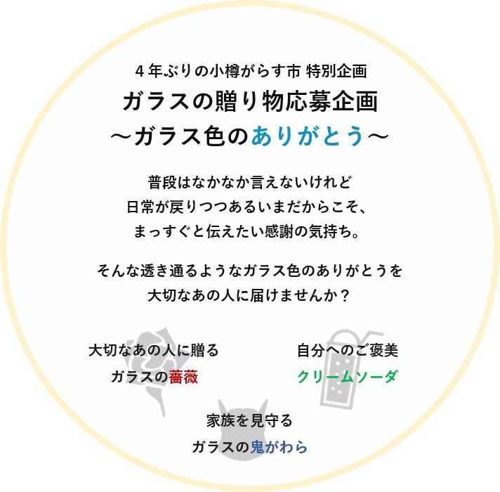小樽がらす市は、単にガラスの魅力をたくさんの人に知ってもらうだけのイベントではありません。小樽がらす市をきっかけに、コミュニケーションが生まれたり、日常生活が豊かになったりと、それぞれの暮らしや生き方に彩りを届けられるようなイベントでありたいと思っています。
