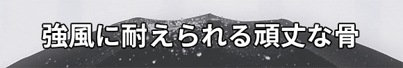 8本の親骨はグラスファイバーやステンレスを、中棒は鉄を採用しているため、軽量ながら頑丈です。テストレポートによると、10m/s風速の5階級疾風に耐えられるそうです。