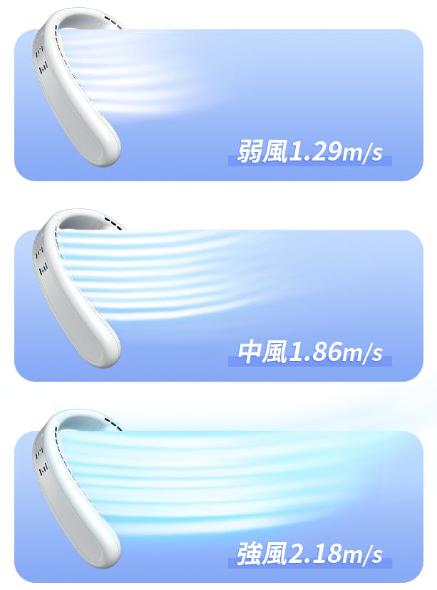 風量は3段階(1.29m/秒、1.86m/秒、2.18 m/秒)あり、暑さやお好みに合わせて調節できます。