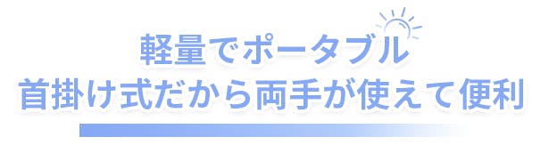 また、首掛け式で両手がふさがらないので、読書や食事、スマホの操作中や自転車に乗っている時にも便利。雨の日に傘をさしたり、お子様の手を引いてあげたりしながら使用することができます。