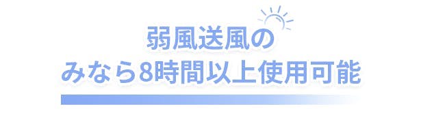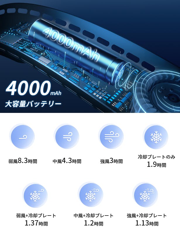 4000mAh大容量バッテリーを搭載しており、送風+冷却プレートの併用なら2時間、弱風モードで送風のみなら8時間以上使用可能です。屋外のレジャーで1日中外にいながら、心地よい風を感じることができます。