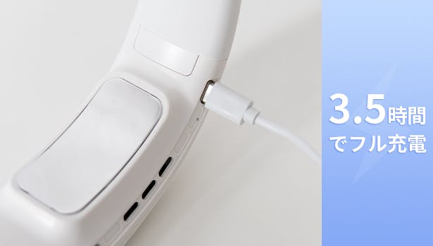 USB-Cポート充電対応で、フル充電の所要時間は約3.5時間です。旅行先のホテルなどで、または屋外でもモバイルバッテリーから充電でき、大変便利です。