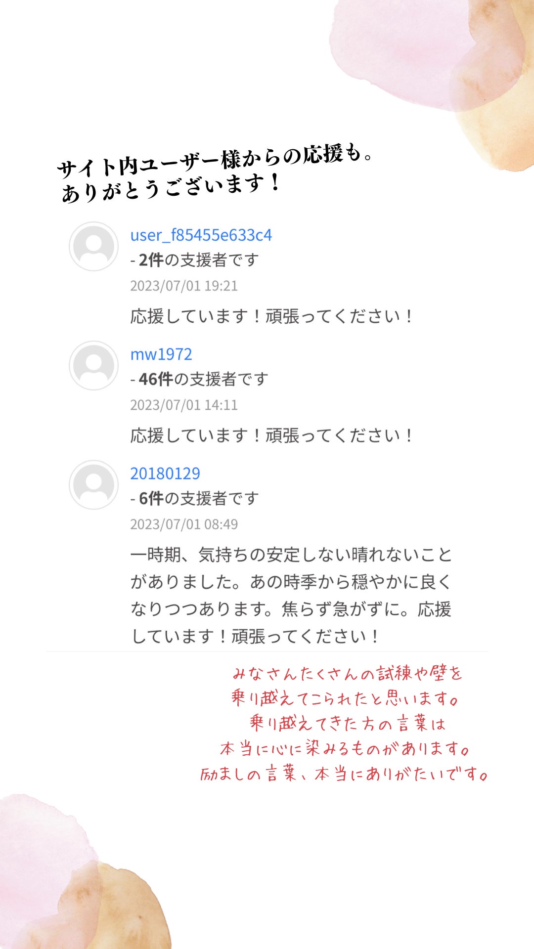 応援と励ましの言葉を本当にありがとうございます。嬉しいです。