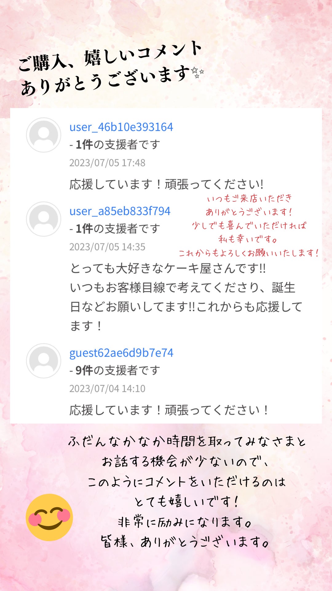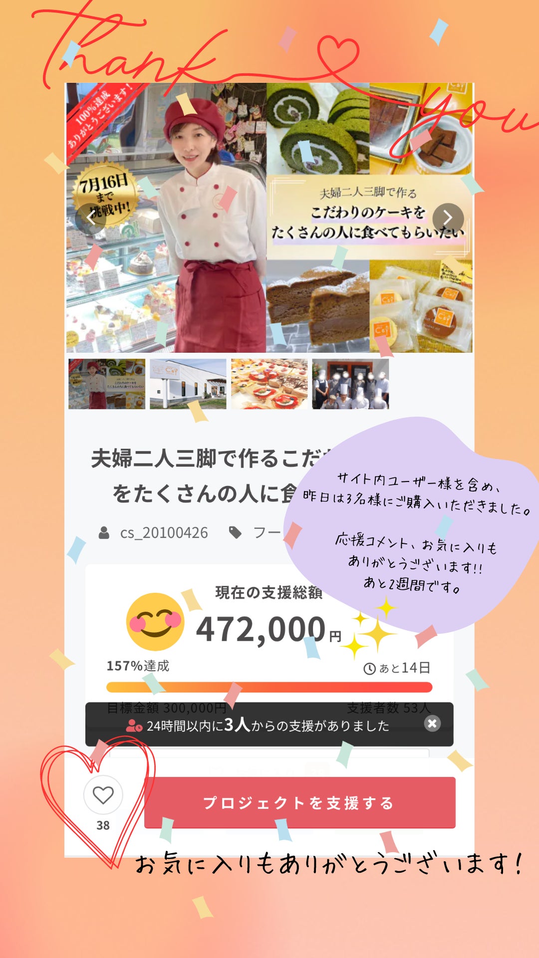 お疲れ様です、『万国洋菓子処シーズ』の瓜守由美です。6月16日からスタートしたこのプロジェクトも3週目に突入し、残り10日となりいよいろ終わりが見えてきました。これまでなんと59名の方にご支援いただき、本当~~に嬉しい限りです。本当にありがとうございます!ご来店いただき直接励ましをくださった方、ケーキを買ってくださった方、皆様からあたたかい気持ちをいただいた期間になりました。もう少し続きますので、引き続きシェア&拡散いただけますと幸いです。お店では7月限定バージョンでプリンショートが登場しております!そして大人気のももタルトもフルーツケーキはタルトが非常に人気なので、気合い入れて作っています♪完熟のフレッシュなももを味わっていただきたいです(*^-^*)かなり暑くなり夏!!な感じですね。体調に気を付けて過ごしましょう!瓜守由美