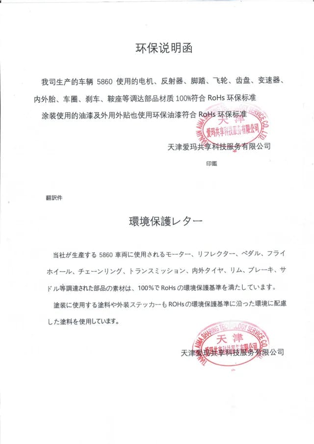 自転車の部品は、EUの環境保護基準「RoHS」を100%満たした部材を使用。環境に配慮した、ECOな自転車です。