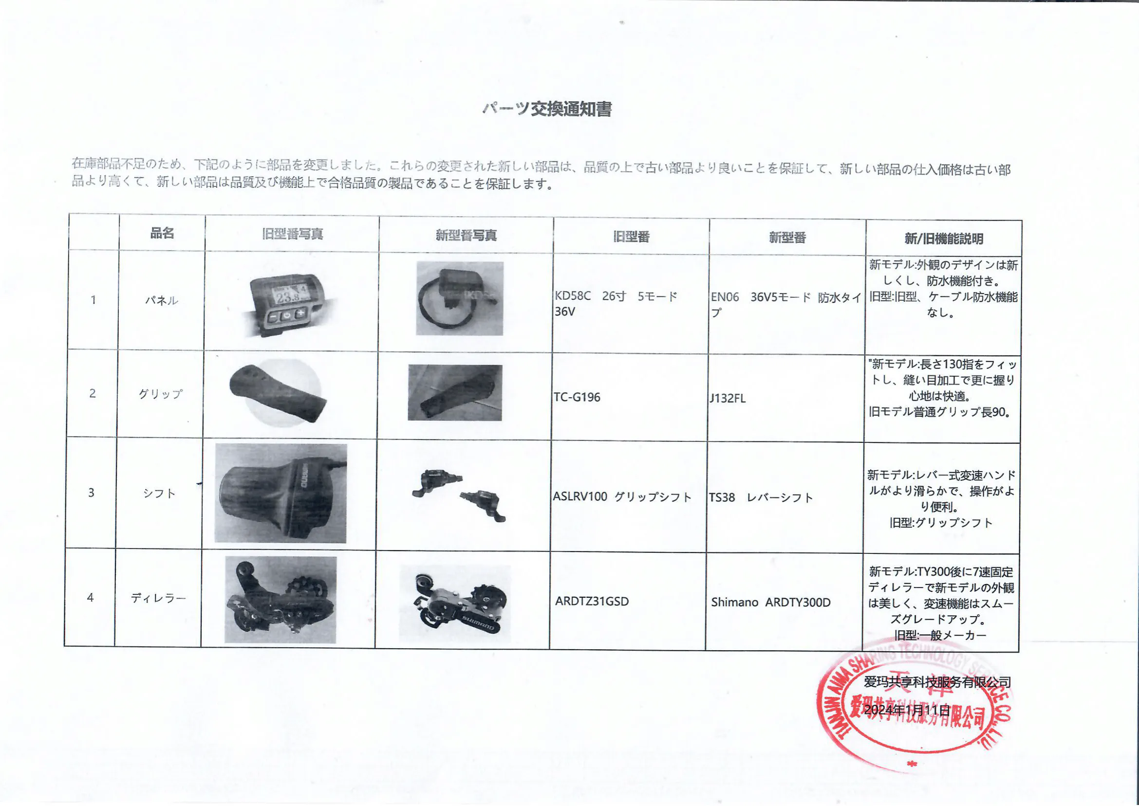自転車の一部仕様変更について