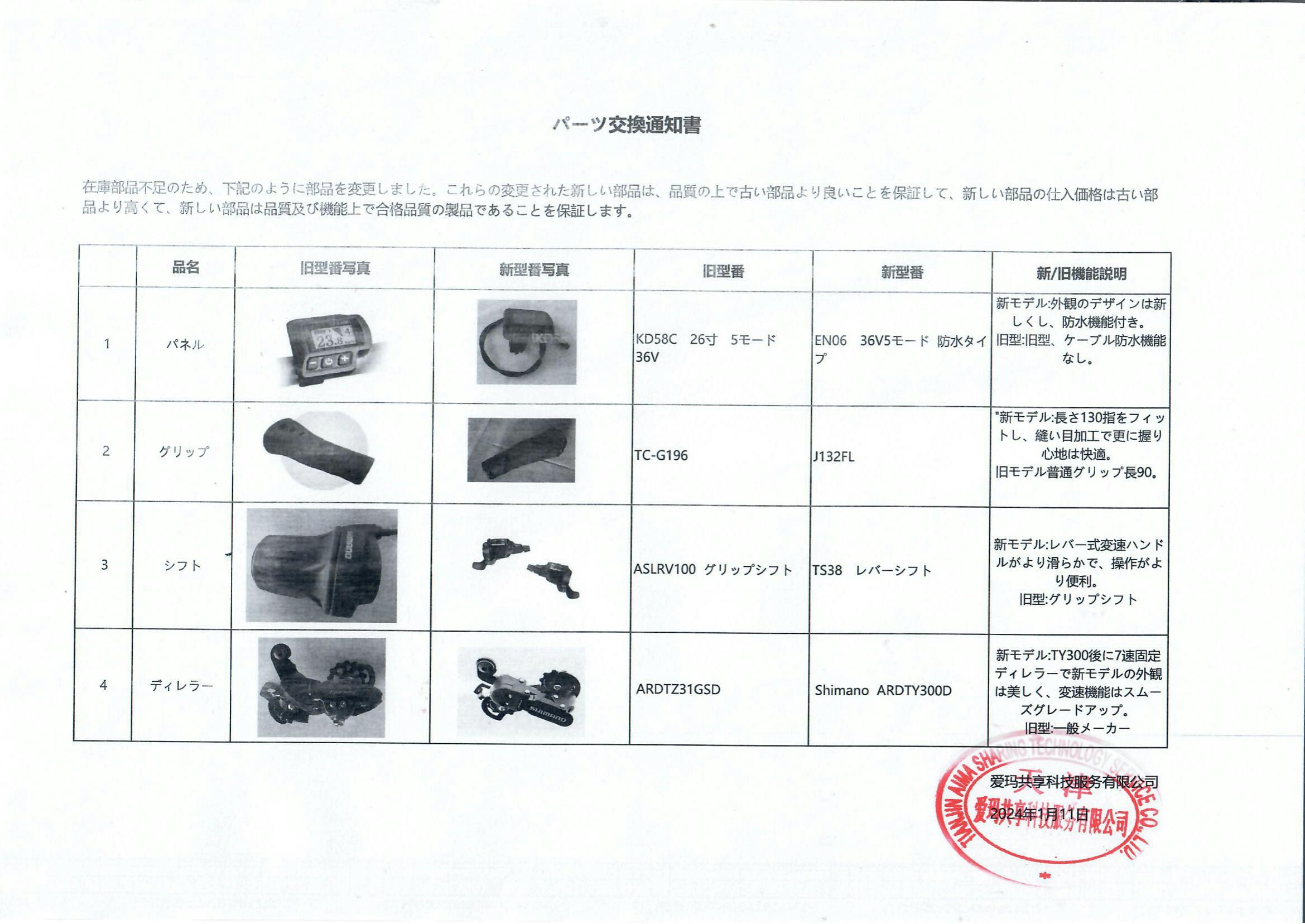 お世話様です 12月22日に無事到着しました。 ありがとうございました。 以下、気 付いた点等を送りますので 、 ご検討 回答お願いいたします。 アップされた組み立て 動画は見ております。 お忙しいところ申し訳ありませんが、 年内にご一報いただけると幸いです。 ●仕様に関する件 ①ギアのシフトレバーが異なる。 ハンドルグリップを回転させるタイプであるはずでが レバー式になっている。取扱説明書でも違っている。 ②泥除けの形状がホームページと異なる 。 ③コントローラーの表示形式が 取扱説明書と異なる。 ●全てのものに対する 仕様変更なのか 当方のものだけの問題なのか お知らせください。 ●組み立て 要領に関する件 ④開梱包 組み立て要領に関する資料が欲しい。 使用部品の員数、説明がない。 後輪 泥除け用の設置方法 のビデオ または 要領書を作って欲しい。外観も不明。 ●今後の対応についてご一報ください。 開梱包時に要領も無く苦労しましたので、梱包材などは破壊してしまいました。 以上、ご対応のほどよろしくお願いいたします。