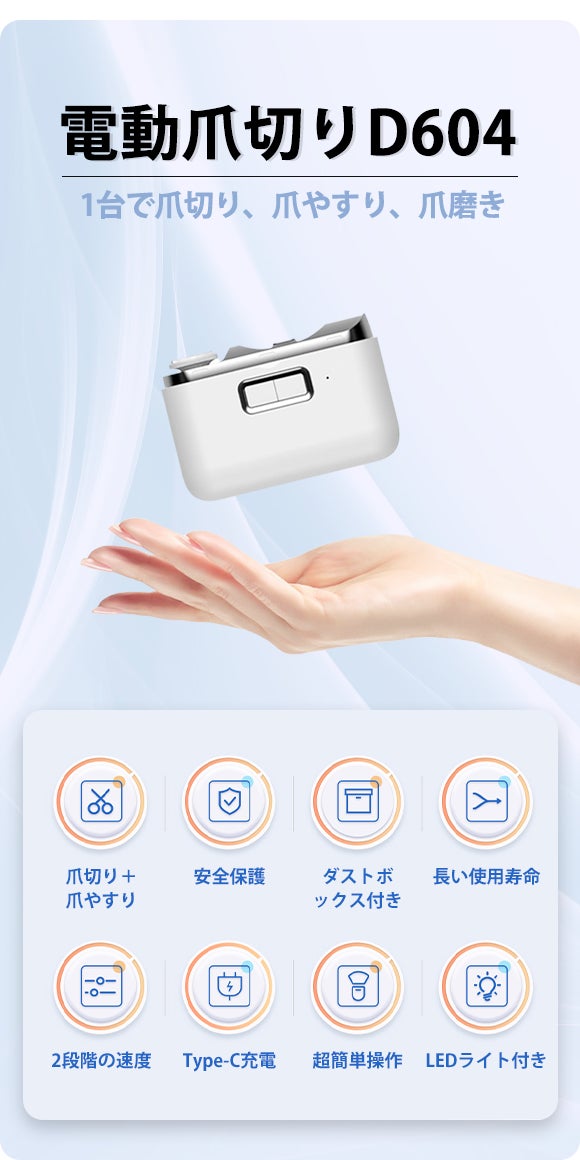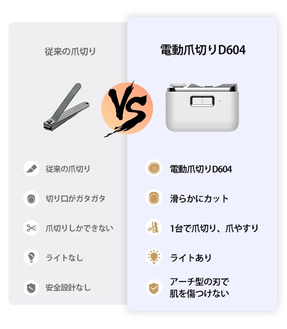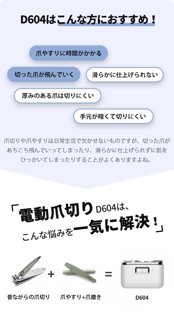 そんな方はぜひ電動爪切り「D604」をお試しください!意外に手間と時間がかかる爪切りを、驚くほど楽々スピーディーに終わらせることができます!