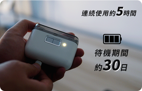 500mAhバッテリーを内蔵しており、フル充電で約5時間連続使用できます。また、Type-C急速充電技術を採用しておりますので、USBケーブルですばやく充電可能です。