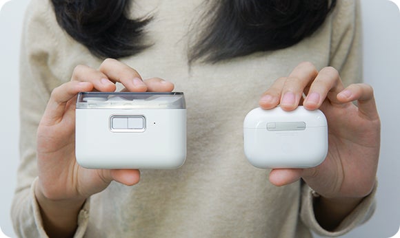 D604は重さ82g、大きさはBluetoothイヤホンのケースのような超小型で携帯しやすく、人体工学に基づいた持ちやすい設計となっています。