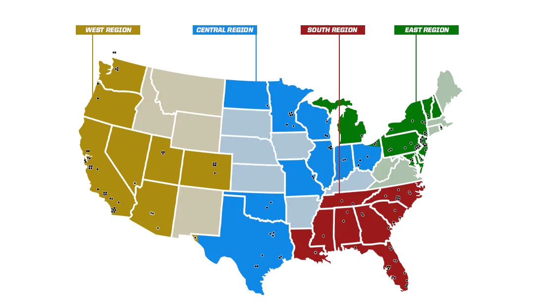 登録チームは現在141チームあり、全米50州あるうちの32州にチームが点在してます。アメリカだけではなく、カナダ・バンクーバーにもチームが存在します。4つの地区の中にカンファレンスが存在し、その中で更に地域ごとにディビジョンとして分かれシーズンを行い、レギュラーシーズンを通しカンファレンスで勝ち上がったチームが、全米1位の座を目指すトーナメントを戦います。
