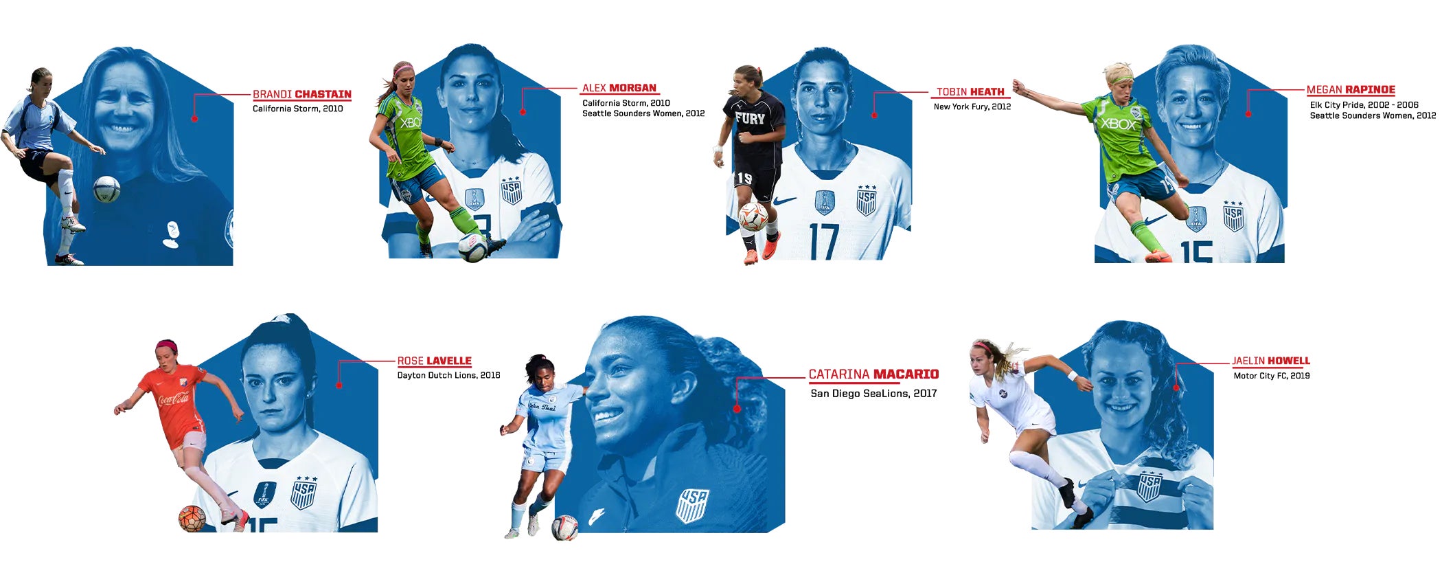 WPSLを経てプロの道へキャリアを伸ばしてきた選手は累計1000人を超え、下記のアメリカ代表主力選手以外にも、ワールドカップやオリンピックへの出場経験のある選手や、現在米国1部NWSLで活躍する選手、海外のプロリーグへ挑戦している選手も数多く存在します。