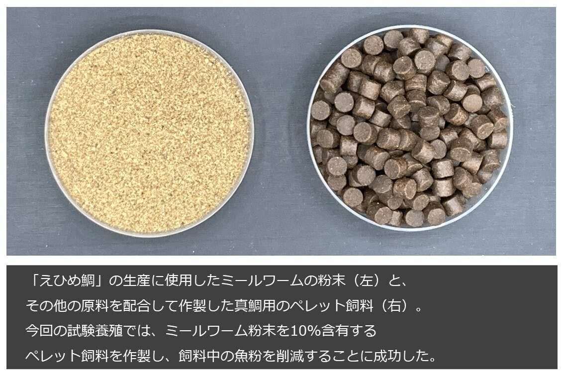 「えひめ鯛」と名付けられた真鯛は、愛媛大学(えひめだい)の三浦猛教授らが開発した飼料で育てられた新しい養殖真鯛であり、愛媛大学や地元企業の太陽石油らとの産学連携の研究開発によって生まれました。「えひめ鯛」を育てる特別な飼料には、草食系で甲虫の一種であるミールワームの粉末を使用しています。ミールワームは、農業系の副産物を餌として効率的に育つ動物性タンパク質源であり、「えひめ鯛」のサステナブルな養殖が可能となりました。