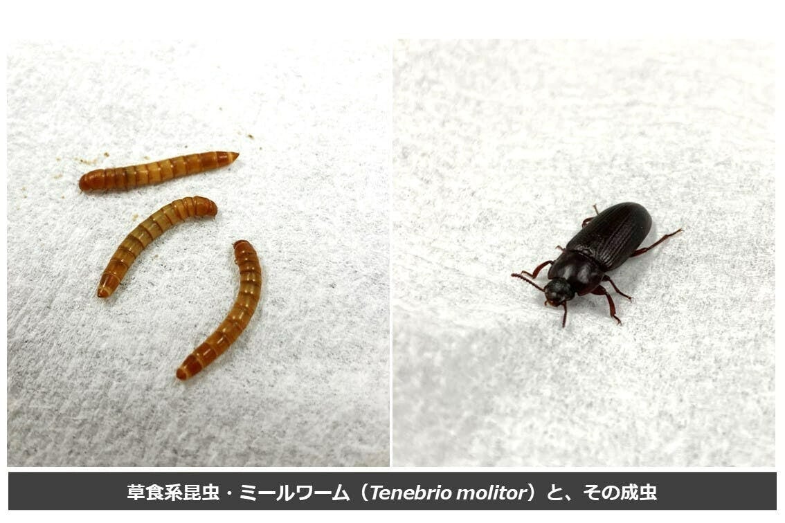 養殖用の魚粉不足は、日本だけでなく、地球規模の問題です。そこで、人為的に生産可能な、飼料用の動物性タンパク質として、昆虫の飼料利用が始まっています。私たちは、多様な昆虫の中から、草食系で甲虫の一種であるミールワーム(Tenebrio molitor)に着目しました。ミールワームは、人が食べる農産物の残渣を餌に育つため安全で、真鯛の嗜好性も高く、飼料には最適の昆虫です。魚粉の一部を昆虫で置き換えた飼料を使用することで、環境負担を軽減させる養殖が可能となります。