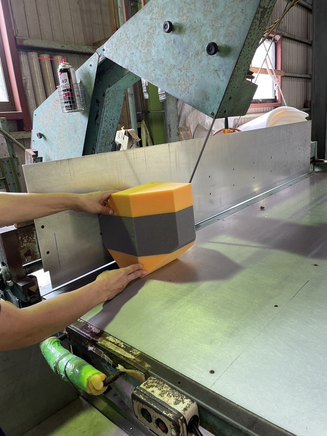 写真は、コアスクイーズは、国内の工場で、一つ一つ手作業で作って頂いています。当初は、金型での大量生産も検討いたしましたが、思い通りの仕上がりにする事が難しく、やはりプロの方々に一つ一つ手作業でカットをして頂くことで、綺麗な仕上がりになります。ムラのない仕上がりになるからこそ、安定したトレーニング効果を生み出せるモンスタートレーニング器具となります。