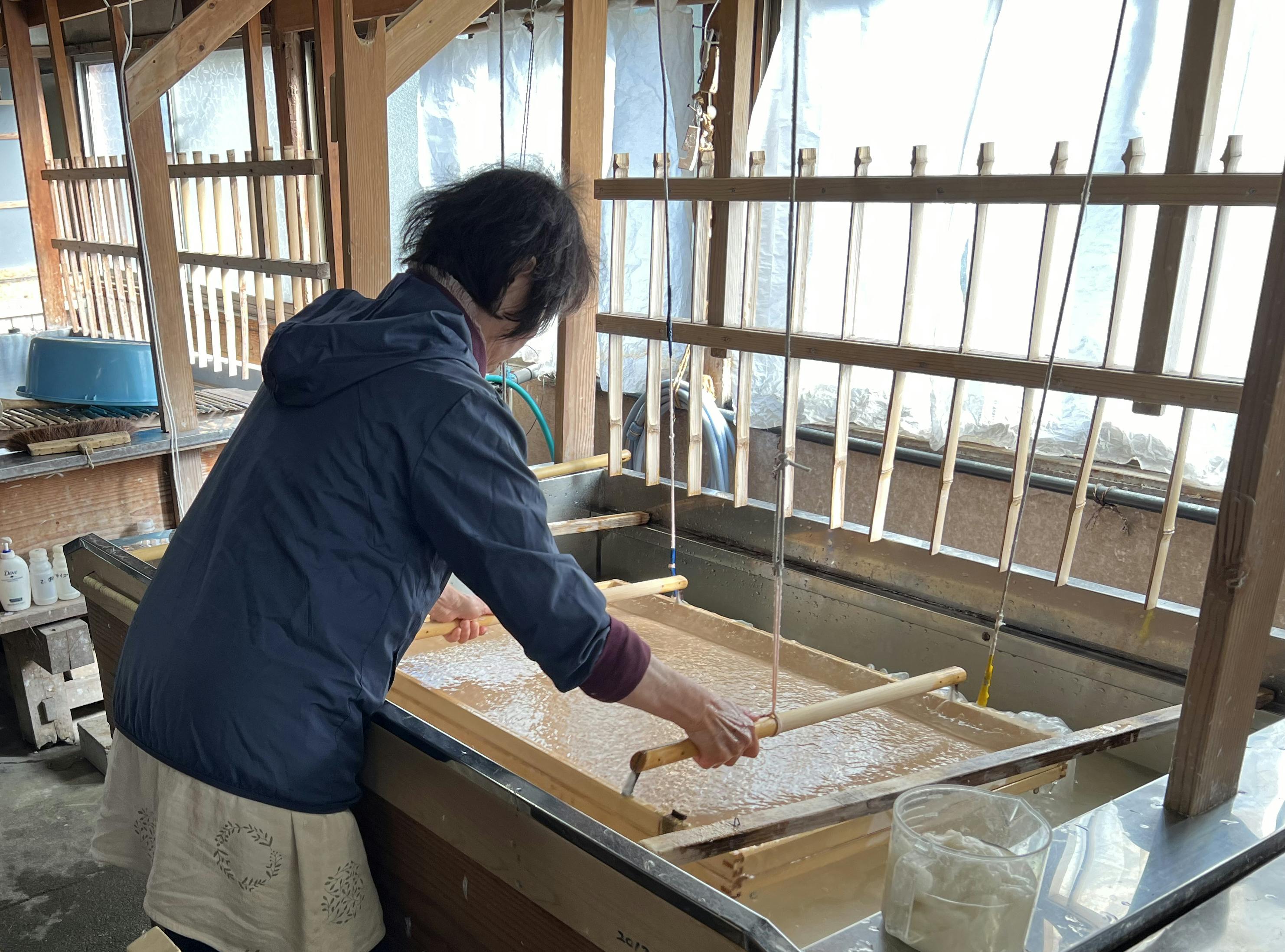 この一筆箋に使用している和紙は、本プロジェクトにご協力いただいている、小川町の紙漉き職人であり、細川紙技術者協会会長の内村久子さんにこの冬に漉いていただいたものです。