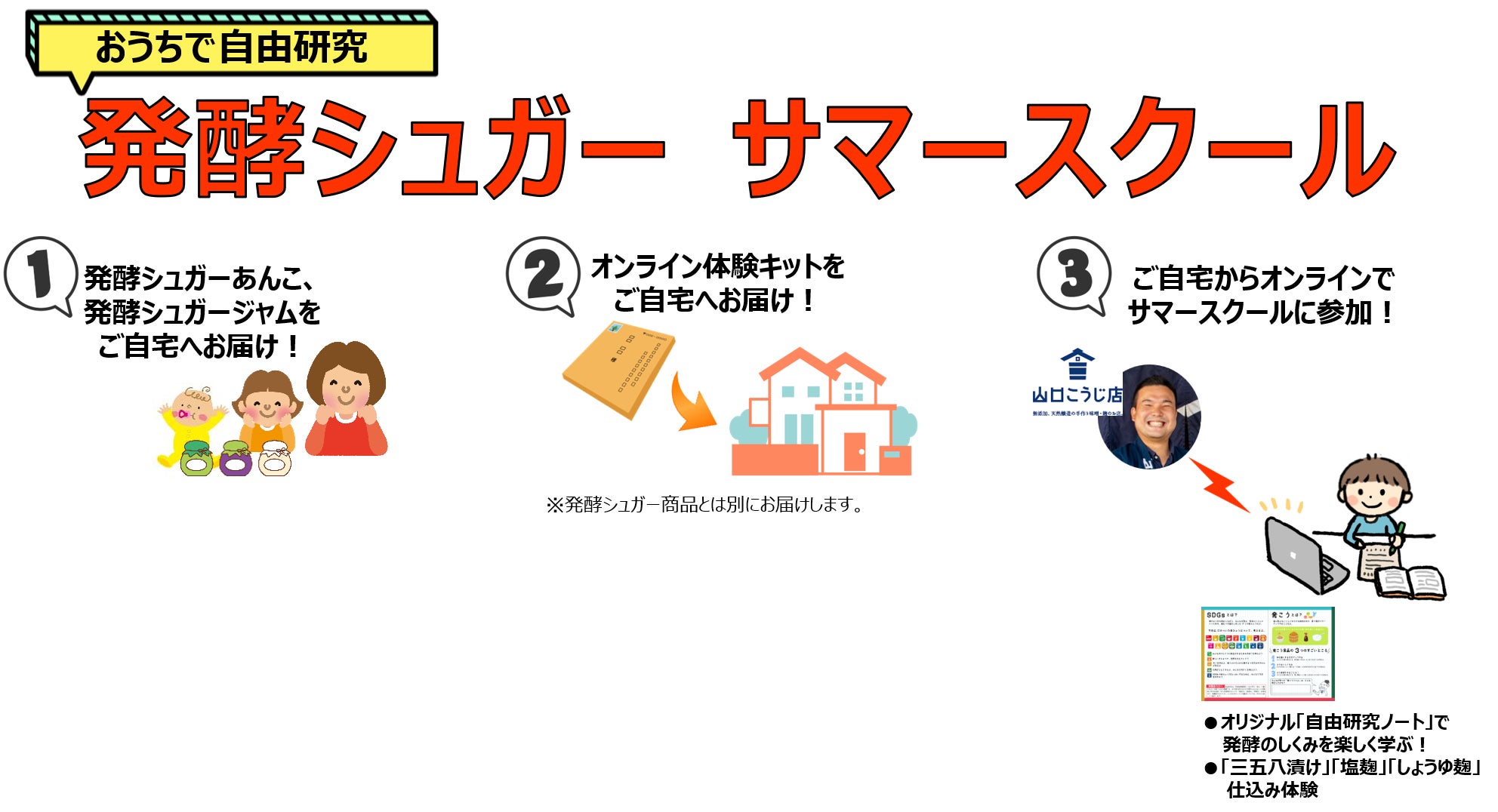 2023/07/10 15:21クラウドファンディング第1弾にご支援いただいた皆様、第2弾にご興味を持ってくださっている皆様、こんにちは。山口こうじ店です。7月に入り、いよいよ夏休みの計画もお考えの頃なのではないでしょうか?本プロジェクトの、夏の自由研究イベント「発酵シュガーサマースクール」の準備も着々と進んでいます。ついに、完全オリジナルの「自由研究ノート」が完成しました!今回リターン品としてお送りする「発酵シュガーあんこ/ジャム」を出発点に、発酵のしくみ(理科的内容)から、SDGsとの関係(社会的内容)まで幅広く学べるノートになっています。また、そのまま書き込みができる「自由研究ワークシート」のページ、親御さんに読んでいただきたい「自由研究をサポートするおうちの方へ」という解説ページも盛りこみました!冊子制作には、監修者として元小学校教諭とSDGs専門家にも参画していただき、本格的で即使える一冊に仕上がっています。「発酵シュガーサマースクール」ではこの自由研究ノートを使いながら、実際にお子さんに発酵食品作りを体験していただきます!夏の自由研究に、夏休みのおうち時間の充実に、家族との思い出作りに、ぜひご活用ください!オンラインを中心に、現地での体験枠もまだ少し余裕がありますので、ぜひご支援・ご参加をよろしくお願いいたします! もっと見る