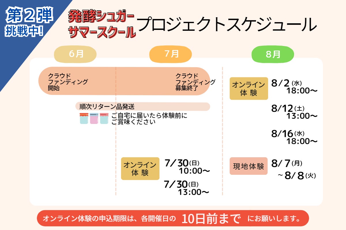 ※オンラインプログラムの申込み期限は、各開催日の10日前までです。誤って期限以降にお申込みされた場合は、体験キット発送手配の都合上、キャンセルとなる場合もありますので、ご注意ください。(8/16のプログラムは、クラウドファンディング期間終了日が申込み期限となります。)