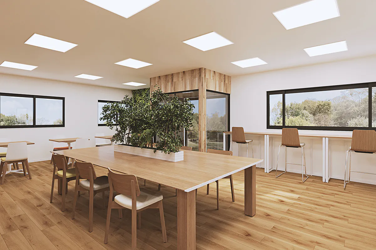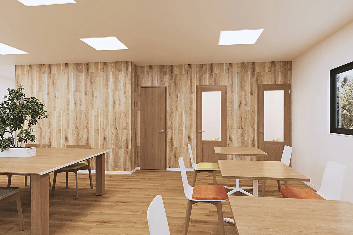 カラーはグリーンをアクセントに、ウッディーな内装やナチュラルなインテリア、自然とのつながりを意識した「バイオフィリックデザイン」を採用しています。