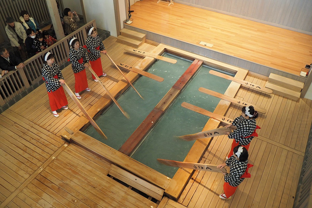 古くから伝わる名物の「湯もみ」は、50℃近い源泉に約180㎝ほどの板を入れて湯をもむという、加水によって温泉の効能を薄めずに温度を下げるために考案されたものでもあります。