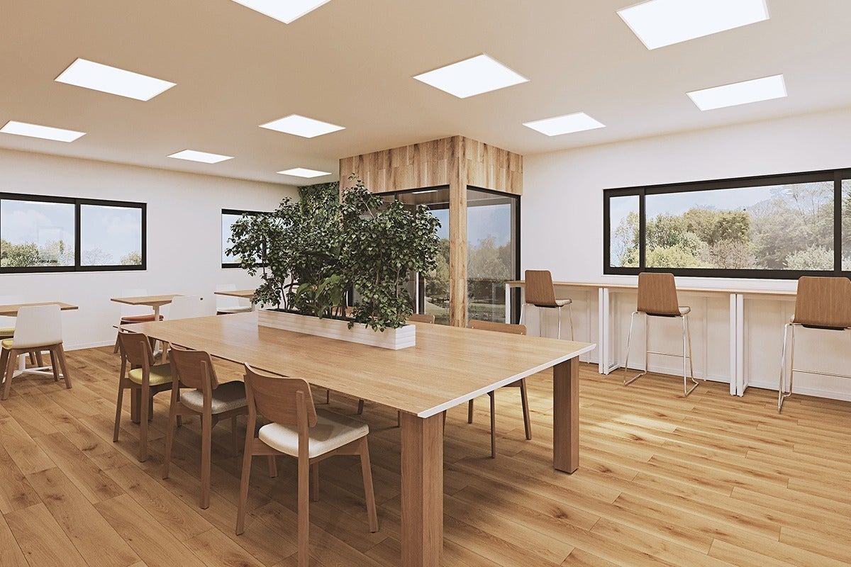 カラーはグリーンをアクセントに、ウッディーな内装やナチュラルなインテリア、自然とのつながりを意識した「バイオフィリックデザイン」を採用しています。