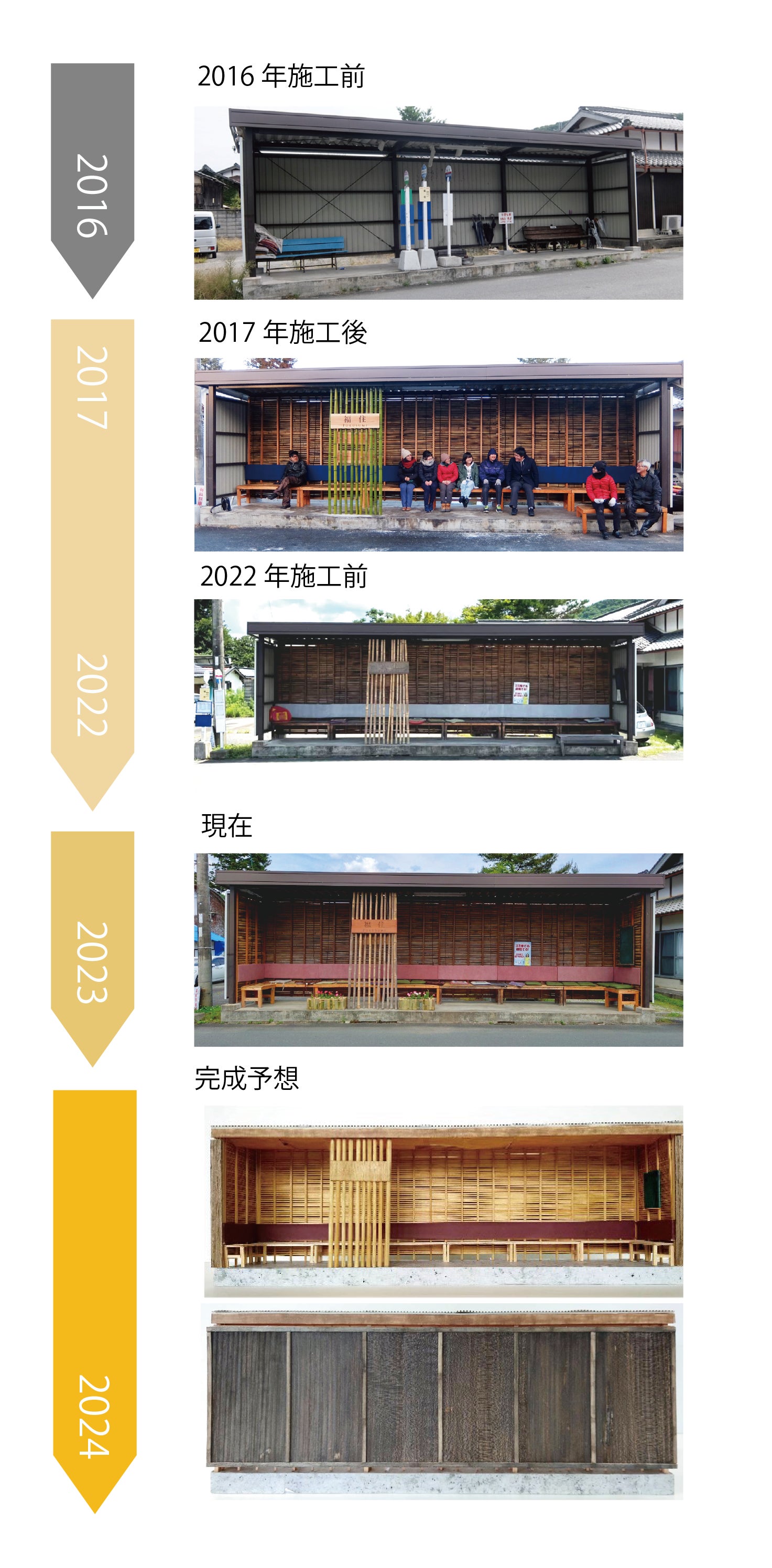 2022年からは、京都大学のプロジェクト主要メンバーが関西大学に移籍したため、関西大学の住環境デザイン研究室が活動を引き継ぎ、2017年度に最初に改修されたバス停「福住」待合所が経年劣化したため修繕を行い、より重要伝統的建造物群保存地区にふさわしい外観となるよう計画・設計しています。