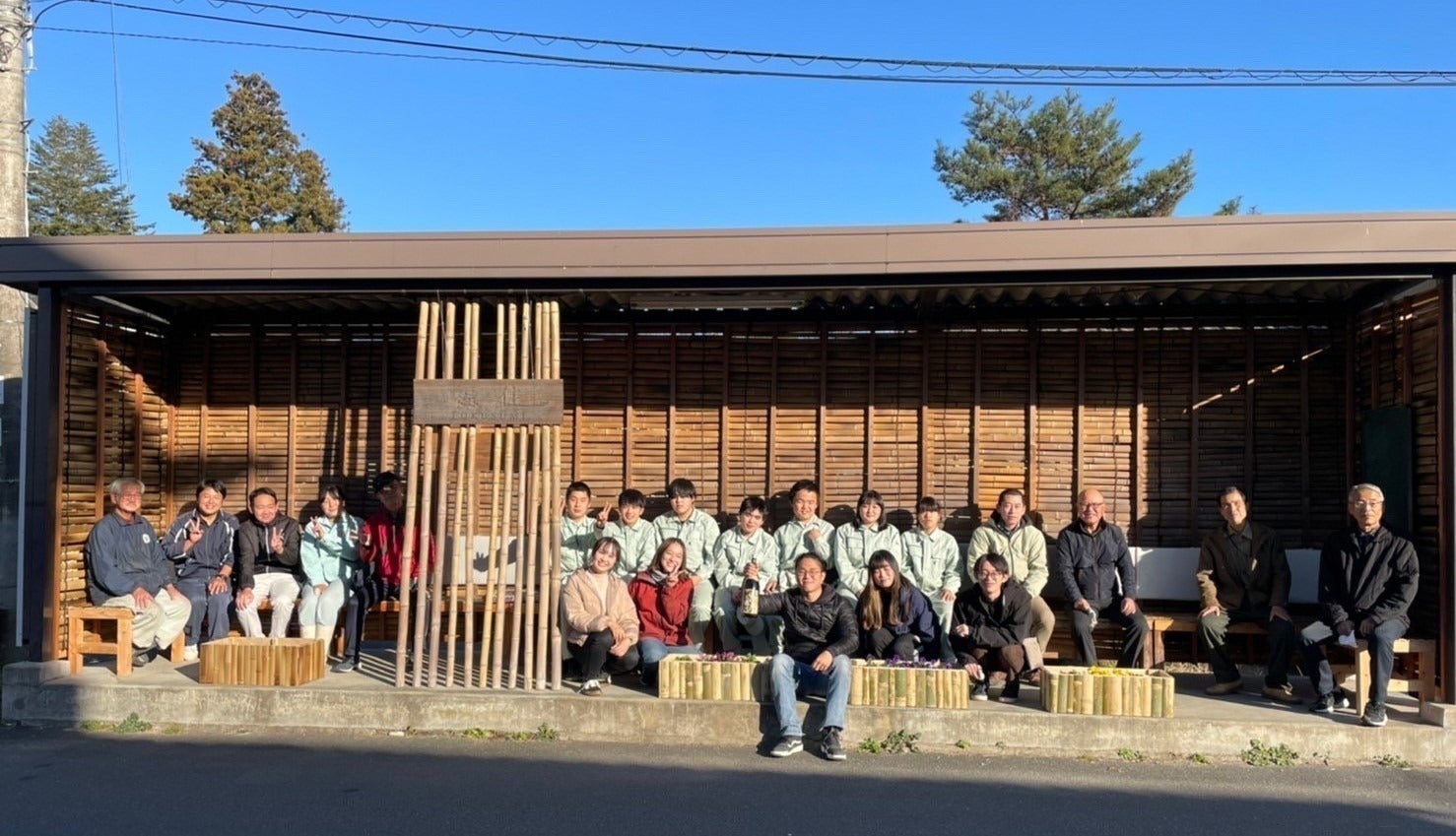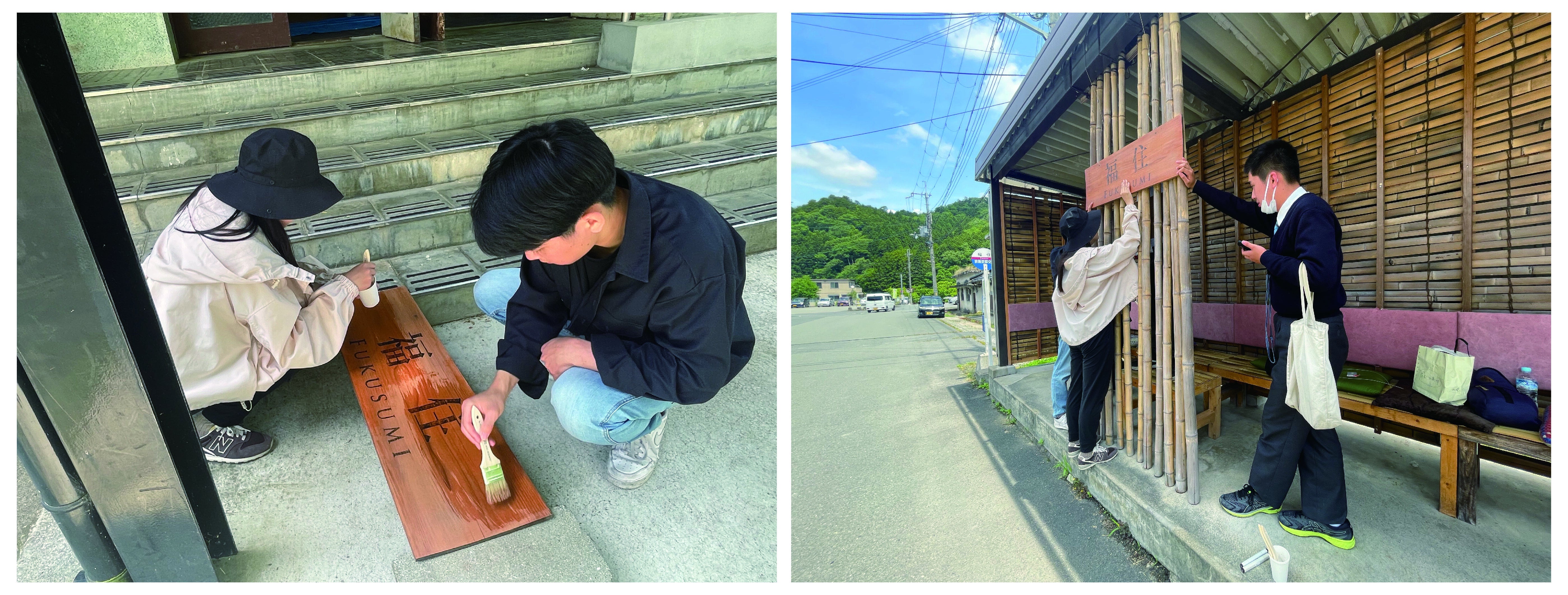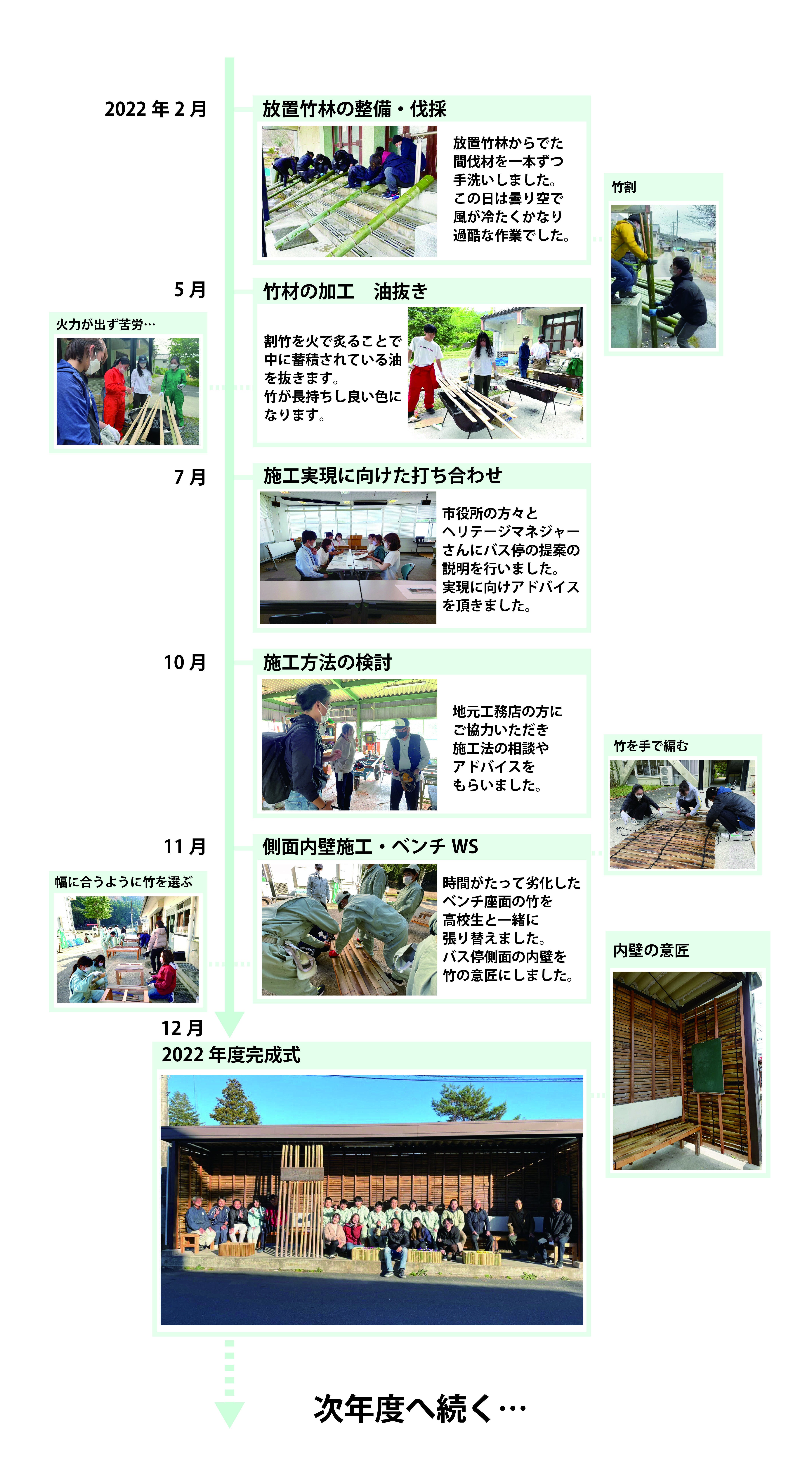 2022年度は2月から5月にかけて竹林から竹を伐採し、油抜き作業(竹を炙り水分油分を取り除くことで虫に食われにくくなり、耐久性がまします)を行い、6月から7月には市役所、ヘリテージマネージャーの方、地域の方々と相談しながらデザイン決定を行いました。9月には福住地区のまちなみ保存会にデザイン案の承認をいただき、10月から12月にかけて地元工務店の方に施工方法などご助言をいただきながらバス停のベンチの修繕・増設、内壁を竹材で加工する作業を行いました。