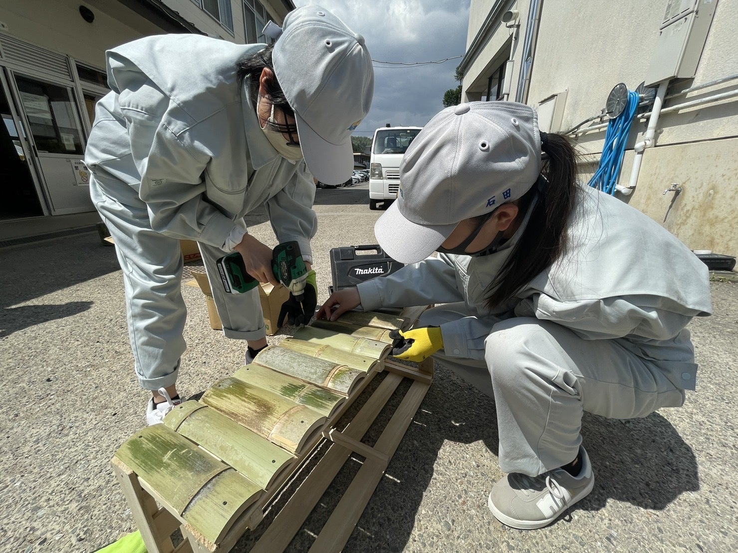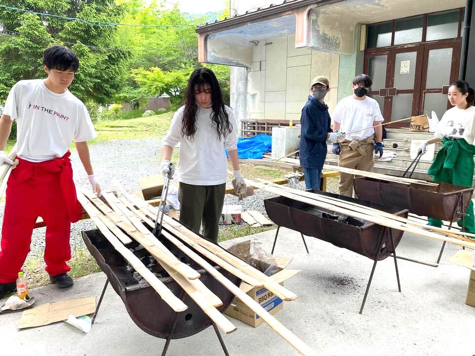 竹の油抜き作業の様子です。SHUKUBAさんの体育館前をお借りし3日間かけて行いました。