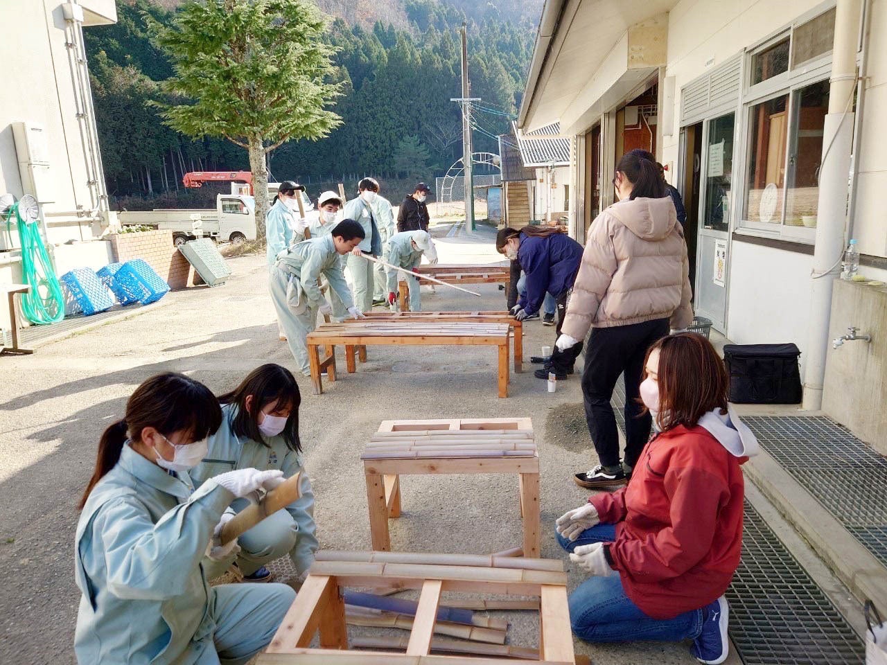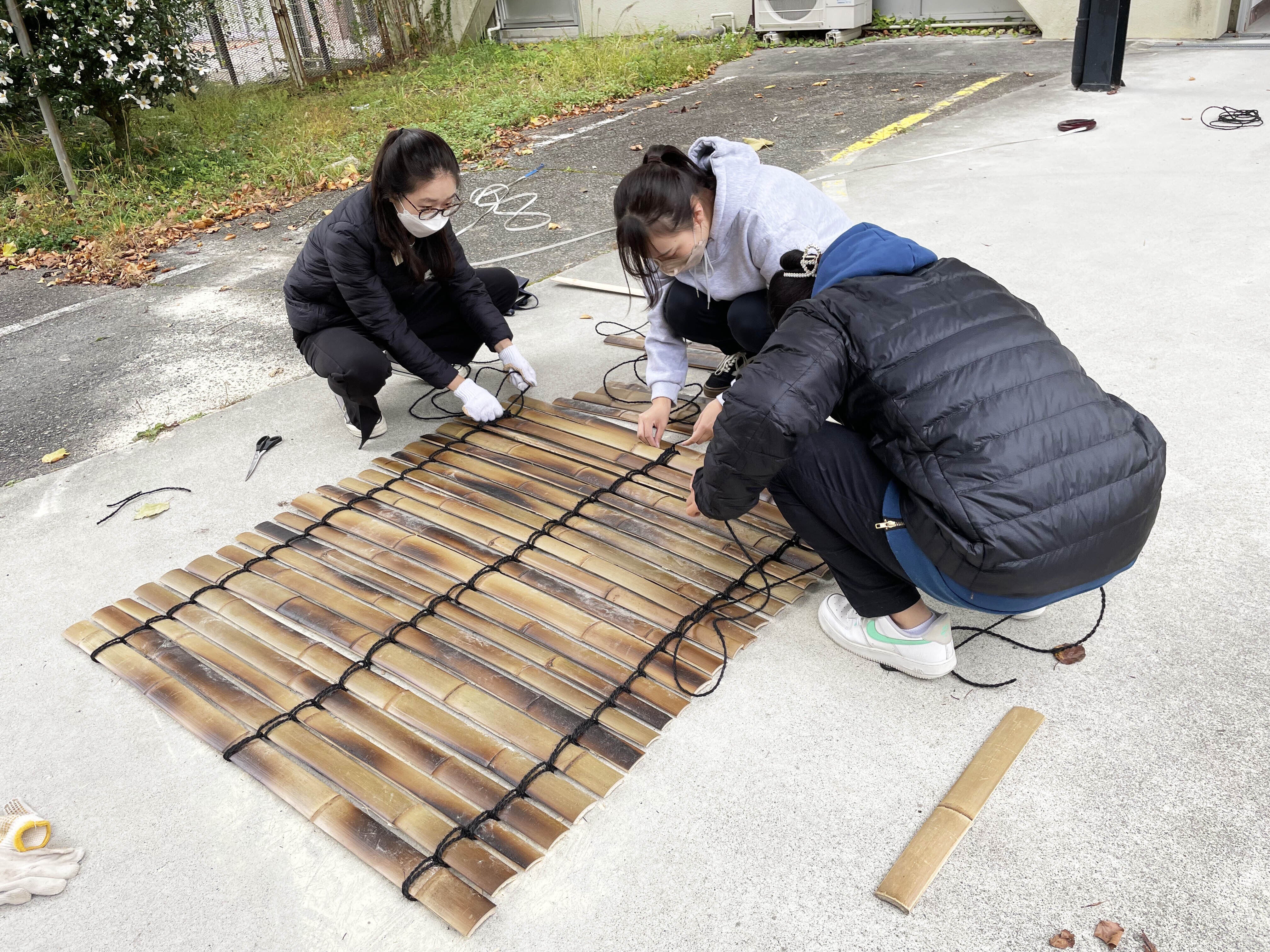 高校生と大学生がベンチの仕上げを行いました。竹材は一つ一つ幅が違うためベンチの幅に合うように組み合わせを考え、丁寧に並べて固定します。編んだ竹とベンチを設置して…