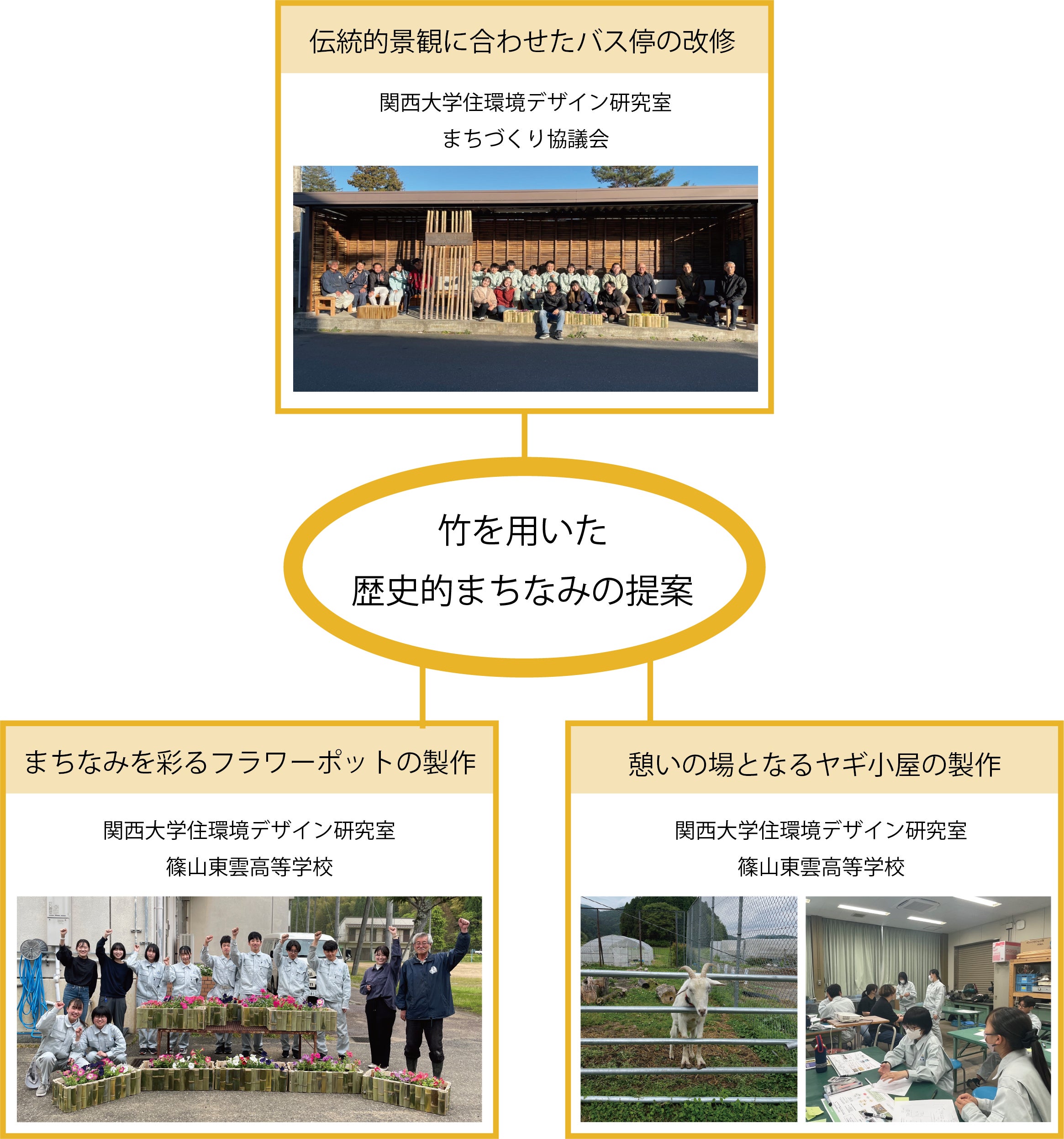 地域の抱える放置竹林の課題解決と歴史的まちなみの景観保全を目的に、私たちはデザイン活動を行なっています。丹波篠山市では放置竹林が大きな課題であり、竹林整備や竹材の新たな活用方法が求められています。私たちは、重要伝統的建造物群保存地区である福住地区において、竹を用いた歴史的なまちなみを提案したいと考えています。現在は、バス停待合所の修景、竹のフラワーポット製作、地域の人たちの憩いの場となるヤギ小屋製作の実現を目指しています。