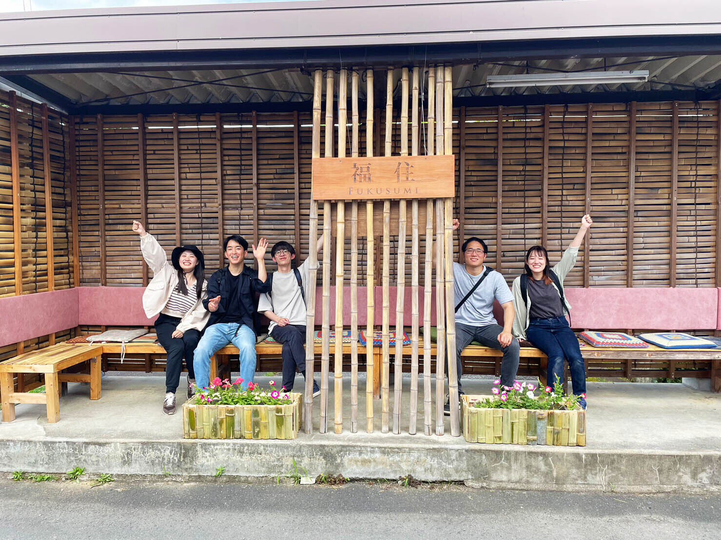 関西大学住環境デザイン研究室は、建築学生であることを活かし、福住地域の方々がやりたいことを実現するお手伝いや、まちなみへの提案として、バス停の改修案、竹のフラワーポット・竹のベンチなどの設計・施工を地域でおこなっています。材料として放置竹林からの間伐材を利用しながら福住地区のまちなみがより豊かに、より地域の方々に愛されるものとなることを目指して活動を行っています。