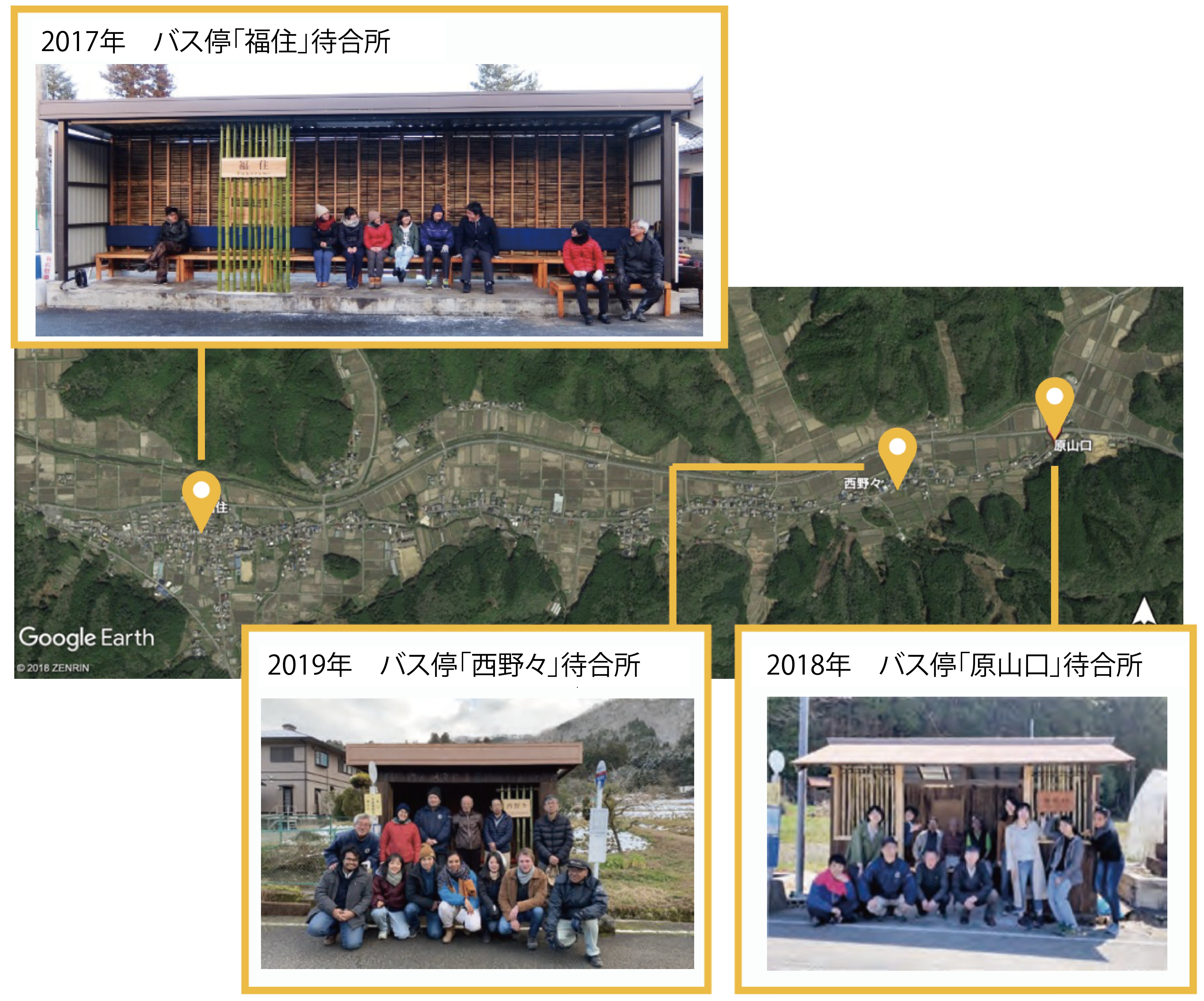 竹の間伐材を用いてまちなみデザインを提案する活動は、2017年に京都大学の学生有志が福住地区の篠山東雲高校で開催した「竹の活用法を考えるワークショップ」にて、高校生より「バス停待合所を改修することで、もっとこの地域に人が来て欲しい」と声が上がったことをきっかけに始まりました。手探りの中、京都大学の有志学生と丹波篠山市地域おこし協力隊がプロジェクトを立ち上げ、福住地区まちづくり協議会、まちなみ保存会、ヘリテージマネジャーの方と相談しながら、篠山東雲高校生、地域の方々が連携して、まず福住地区の顔となるバス停「福住」待合所の改修を実現させました。完成したバス停待合所を見て、他の自治会からも「ぜひうちのバス停待合所も改修してほしい」との声がかかり、2018年に「原山口」、2019年は「西野々」のバス停待合所を竹材を用いて改修してきました。