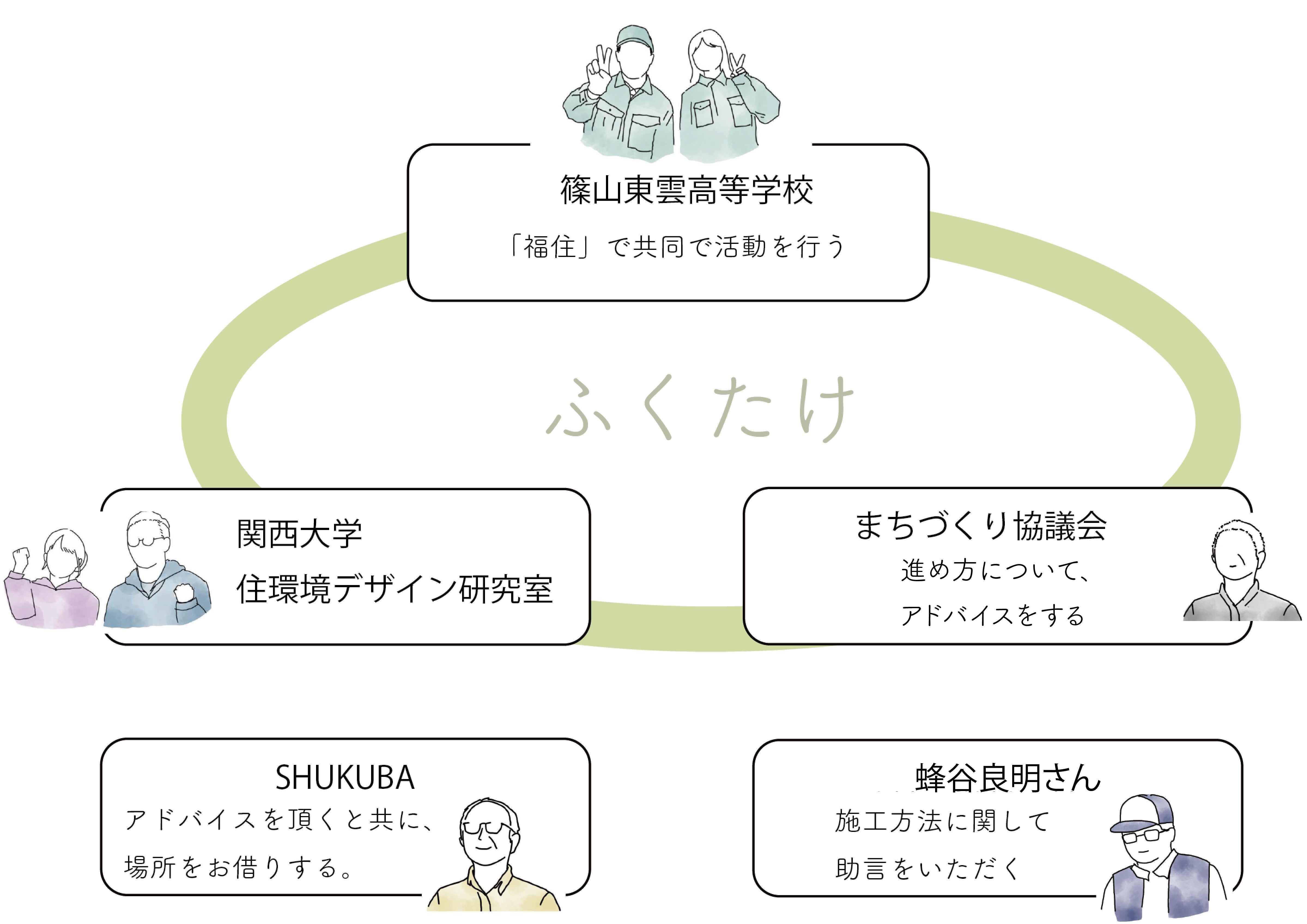 福住地区まちづくり協議会は、住民間の連帯、連携によって、福住地区のまちづくりをおこなっています。 バス停「福住」待合所改修のスタートアップ時より、福住地区で活動を進めるにあたり心得ておくべきこと、福住地区のみなさまに活動を知って頂くためにできることなどについて、話し合いの場で現在でも活動報告や相談にのっています。また、当団体が毎月発行している広報紙「福住さとねっと」に、高校生や大学生の活動の様子を掲載し、広報の面からも協力をしています。